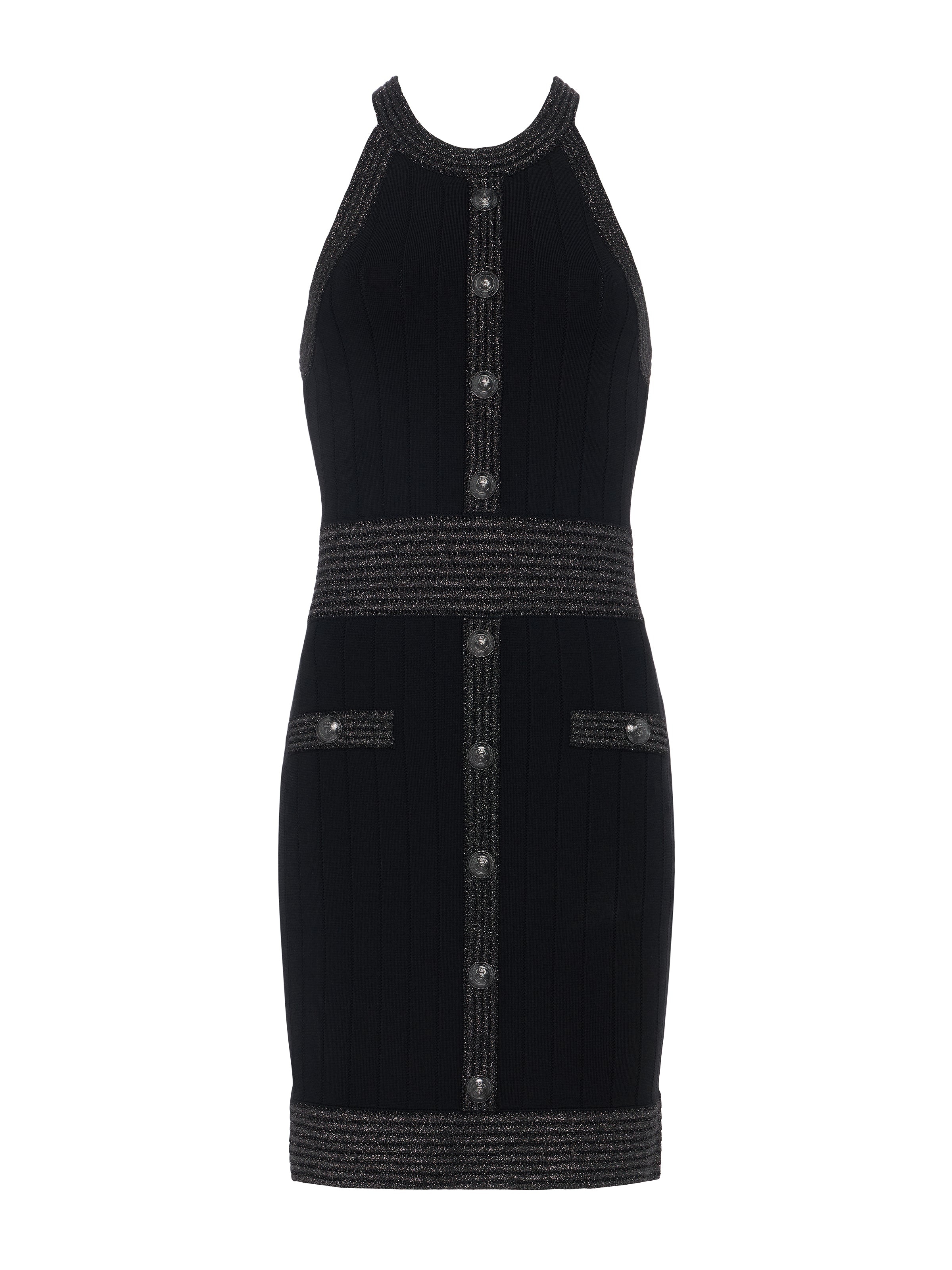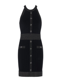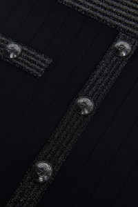 Classic Parisian sophistication meets a super sculpting knit. Lurex detailing accentuates the waist for a beautiful, defined figure. • Ribbed knit with lurex trim • Front faux button placket • Decorative welt pockets • Slim fit • Embossed dome buttons • Back exposed zip closure Style No. 80053NXC2-BGLX DETAILS & FIT - Model Details: Height 5'9" | Bust 32" | Waist 24" | Hips 34" | Wearing Size XS - About 34.5" From Shoulder to Hem MATERIALS & CARE Composition - 52% Rayon 42% Nylon 3% Polyester 2% Spandex 1% Metallic - Imported