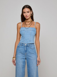 A denim corset top, constructed with figure-defining seams for a flattering fit. • All-cotton denim • Exposed back zip • Cropped length Style No. 40765YRO-LEGD DETAILS & FIT - Model Details: Height 5'10" | Bust 32" | Waist 23.5" | Hips 34.5" | Wearing Size 2 - About 11.75" From Shoulder to Hem MATERIALS & CARE Composition - 100% Cotton - Made in Los Angeles Care - Machine wash