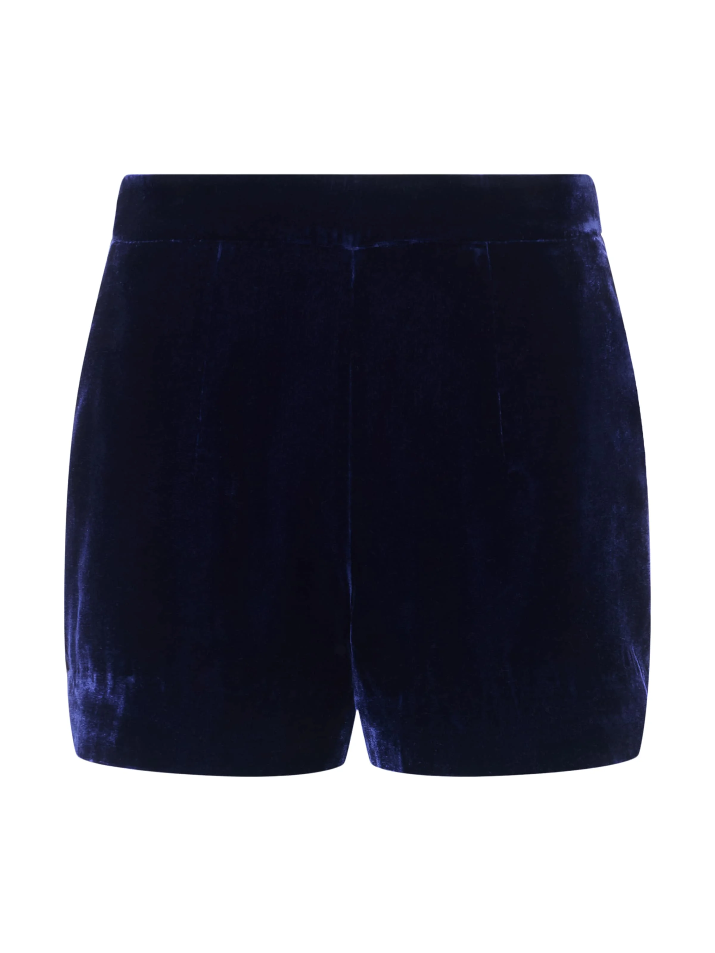 Style No. 2601SVT3-MDNT DETAILS & FIT - Model Details: Height 5'9.5" | Bust 34" | Waist 24" | Hips 34" | Wearing Size 2 - Rise: 11" - Inseam: 3.25" - Leg Opening: 12" MATERIALS & CARE Composition - 82% Viscose 18% Silk - Imported Care - Dry clean only