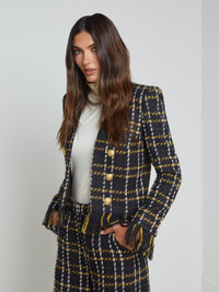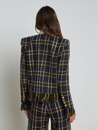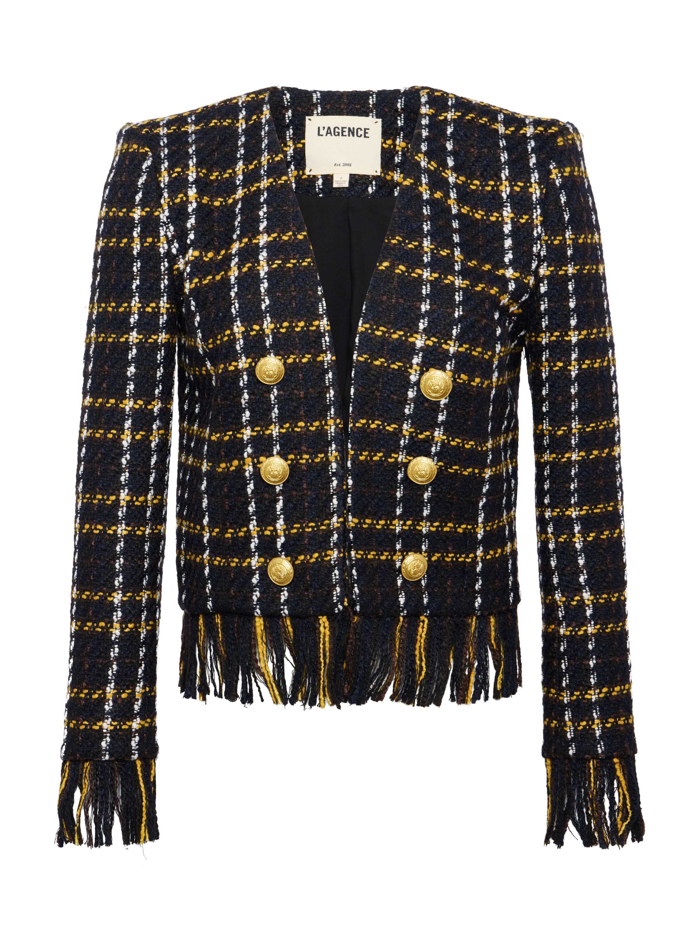 Fringe trim adds a subtle boho charm to this classic plaid jacket. • Tweed plaid • Fully lined • Open-front style • Slightly boxy cropped cut • Strong shoulders • Fringe trim • Embossed dome buttons • Four-button cuffs Style No. 1854TYS-BYMP DETAILS & FIT - Model Details: Height 5'10" | Bust 32" | Waist 24" | Hips 34.5" | Wearing Size 2 - About 20" From Shoulder to Hem - Sleeve Length: 22.8" MATERIALS & CARE Composition - 100% Polyester - Imported