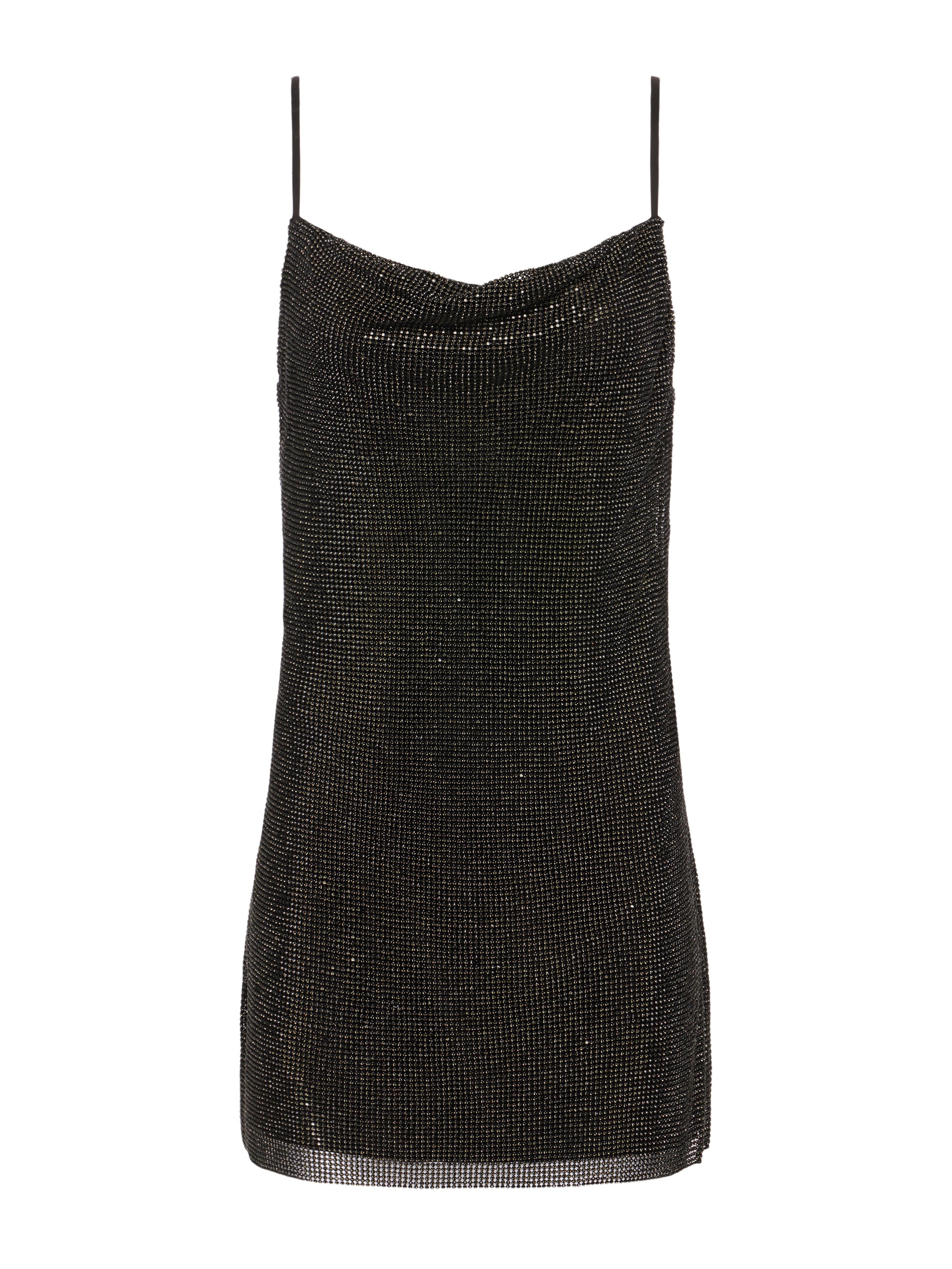 Subtly sexy and utterly glamorous, the Benson is the statement look for every event and invite on your calendar. • Chainmail fabrication • Fully lined • Cowl neck • Adjustable straps • Back exposed zip closure Style No. 61331CVR-GMBK DETAILS & FIT - Model Details: Height 5.9" | Bust 32" | Waist 24" | Hips 34" | Wearing Size 2 - About 28" From Shoulder to Hem MATERIALS & CARE Composition - 60% Aluminum 40% Glass Rhinestone - Imported