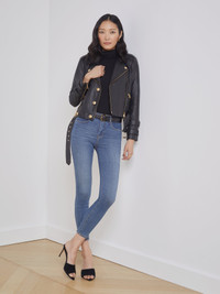Biker style meets feminine elegance. Chic, blazer-inspired details like embossed gold buttons and peaked lapels elevate this black leather jacket, crafted from 100% luxury lambskin. Classic biker elements like an attached leather belt, zippers, straps, and a chunky belt maintain an edgy authenticity. *Slim fit through the arms, size up if you plan to layer* Style No. 1599VSLA-BLAC DETAILS & FIT - Model Details: Height: 5’10" | Bust 34” | Waist 24" | Hips 35” | Wearing Size XS - About 21" From Shoulder to Hem - Sleeve Length: 24" MATERIALS & CARE Composition - 100% Leather - Imported