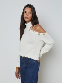 A classic turtleneck sweater, with a sexy spin. Now in versatile ivory. • Premium knit with a hint of wool • One-shoulder style • Relaxed fit • Turtleneck • 3-button cuffs • Decorative embossed dome buttons Style No. S80032SWM-IVGO DETAILS & FIT - Model Details: Height 5'9.5" | Bust 32" | Waist 24" | Hips 35" | Wearing Size XS - About 22" From Shoulder to Hem - Sleeve Length: 20.25" MATERIALS & CARE Composition - 60% Cotton 30% Nylon 10% Wool - Imported Care - Dry clean only