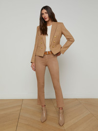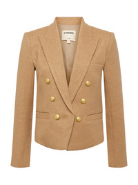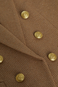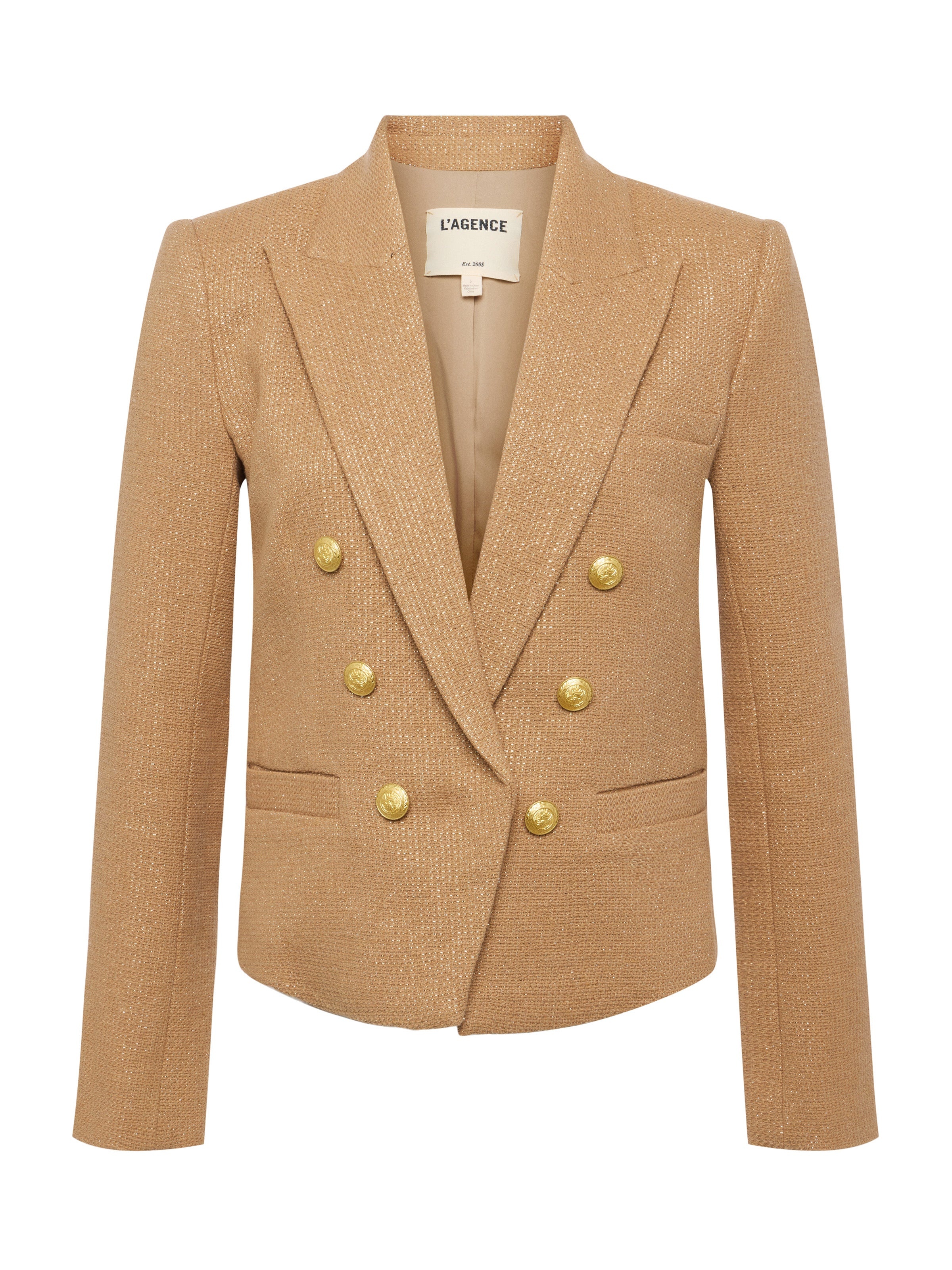 Our bestselling open-front Brooke features a flattering tapered fit. Now offered in an earth tone with a hint of pale gold. • Italian cotton blend with lurex • No closures • Strong shoulders • Welt pockets • Embossed dome buttons Style No. 1626CNQ-LTGD DETAILS & FIT - Model Details: Height 5'10" | Bust 32" | Waist 24" | Hips 34.5" | Wearing Size 2 - About 22.75" From Shoulder to Hem - Sleeve Length: 24.3" MATERIALS & CARE Composition - 70% Cotton 25% Polyester 5% Other Fibers - Imported