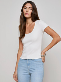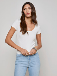 A must-have ribbed tee featuring a flattering scoop neck and a sleek, close fit. Made from a high recovery stretch cotton-modal blend, it's your go-to base layer for any look. • Stretch cotton modal • Fitted Style No. 5816CMR-WHIT DETAILS & FIT - Model Details: Height 5'10" | Bust 32" | Waist 24" | Hips 34.5" | Wearing Size XS - About 21" From Shoulder to Hem - Sleeve Length: 5.5" MATERIALS & CARE Composition - 47% Cotton 47% Modal 6% Spandex - Made in Los Angeles Care - Hand wash