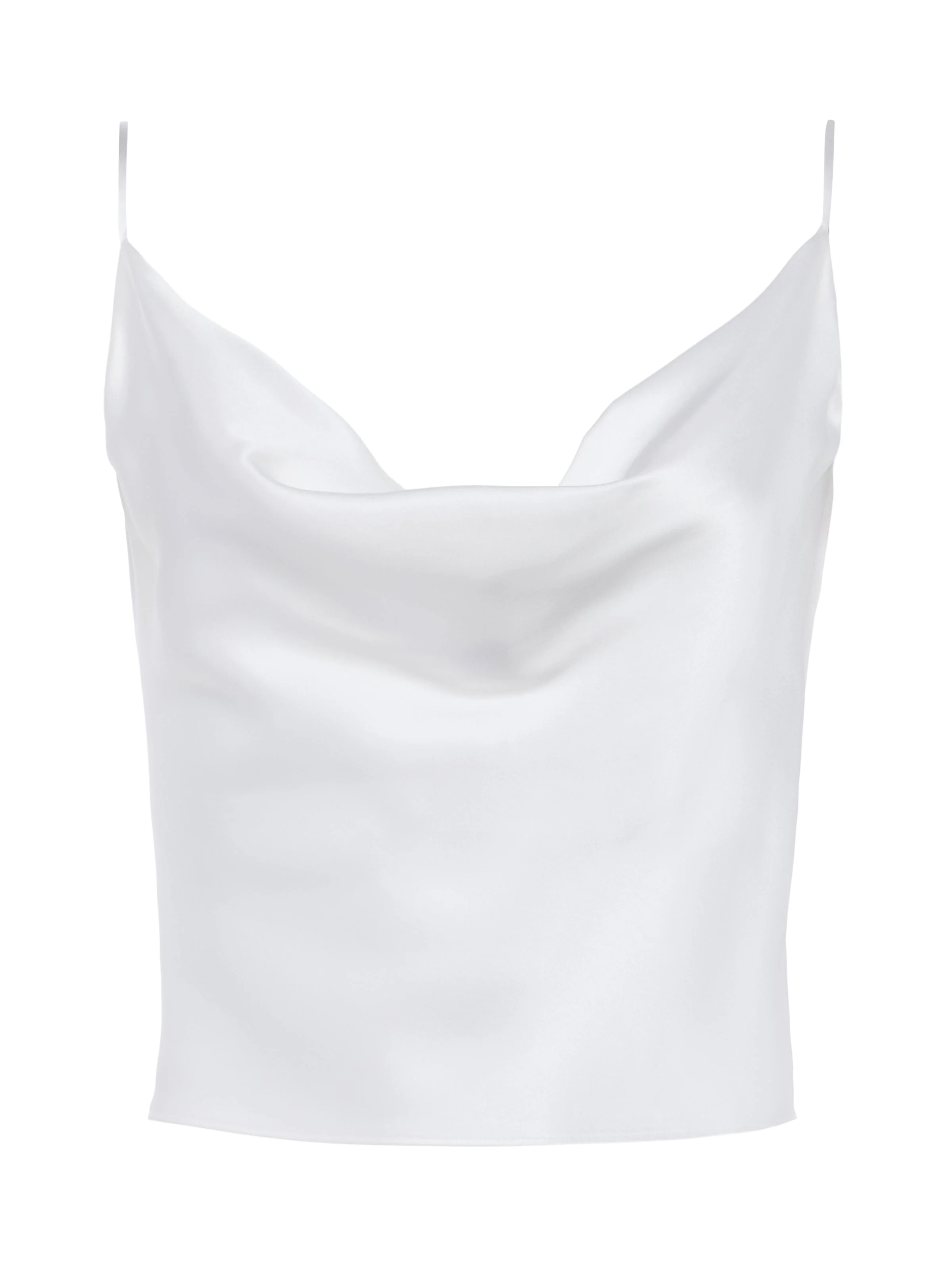 Our newest silk camisole is constructed with a weighted cowl neck for secure, artful draping. Now in timeless white. • 100% silk charmeuse • Bias cut • Weighted cowl neck • Adjustable straps • Cropped length Style No. 40657CLW-WHIT DETAILS & FIT - Model Details: Height 5'9" | Bust 32" | Waist 24" | Hips 34" | Wearing Size XS - About 14.75" From Shoulder to Hem MATERIALS & CARE Composition - 100% Silk - Imported Care - Dry clean only - Do not wash - No bleach - No tumble dry - Low iron if needed
