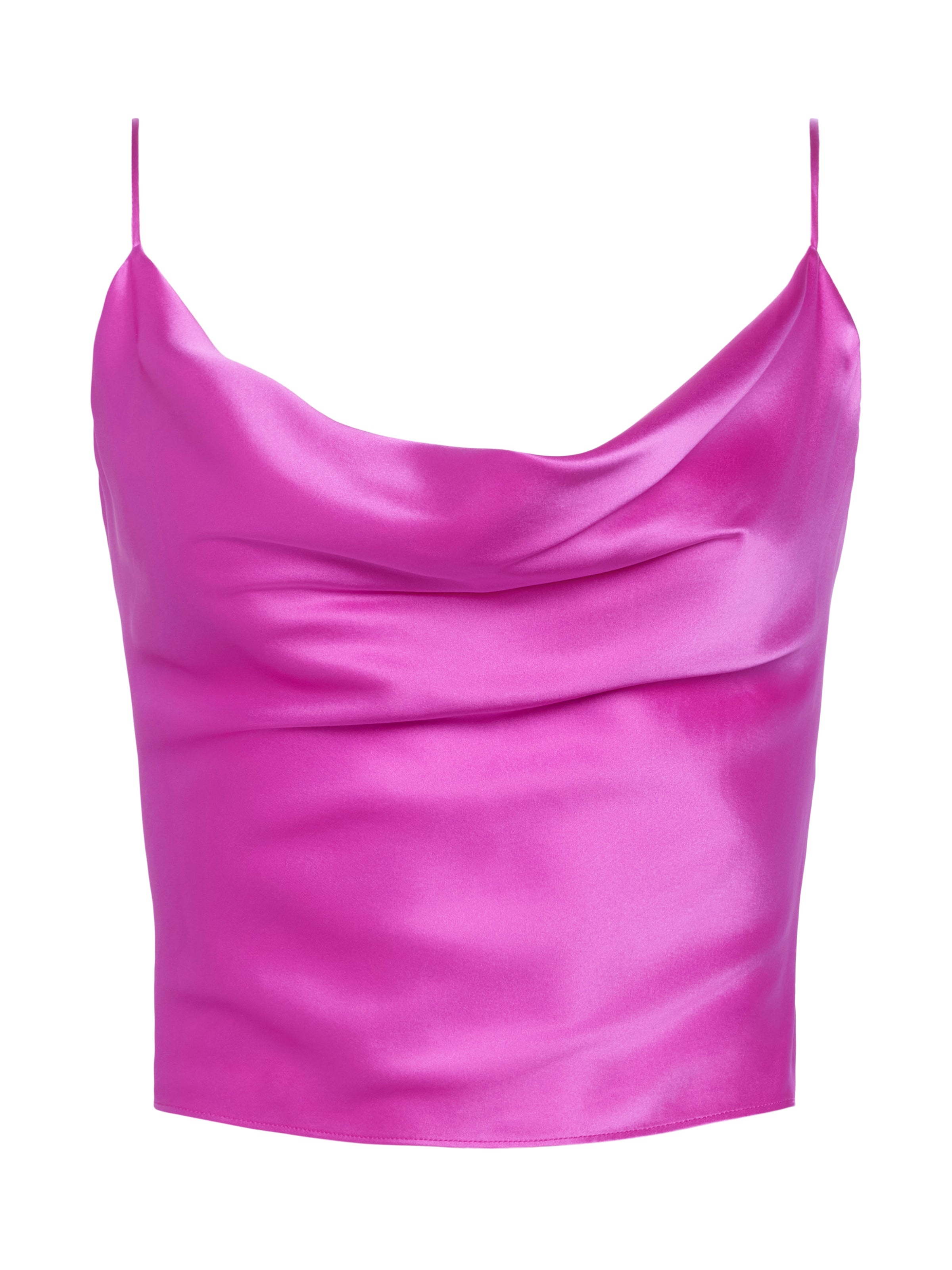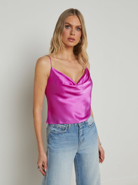 This style debuted at our Spring ’25 NYFW presentation. Our Calista silk camisole is constructed with a weighted cowl neck for secure, artful draping. Now in bright purple. • 100% silk charmeuse • Bias cut • Weighted cowl neck • Adjustable straps • Cropped length Style No. 40657CLW-BRPH DETAILS & FIT - Model Details: Height 5'10.5" | Bust 33" | Waist 24" | Hips 34" | Wearing Size XS - About 14.75" From Shoulder to Hem MATERIALS & CARE Composition - 100% Silk - Imported