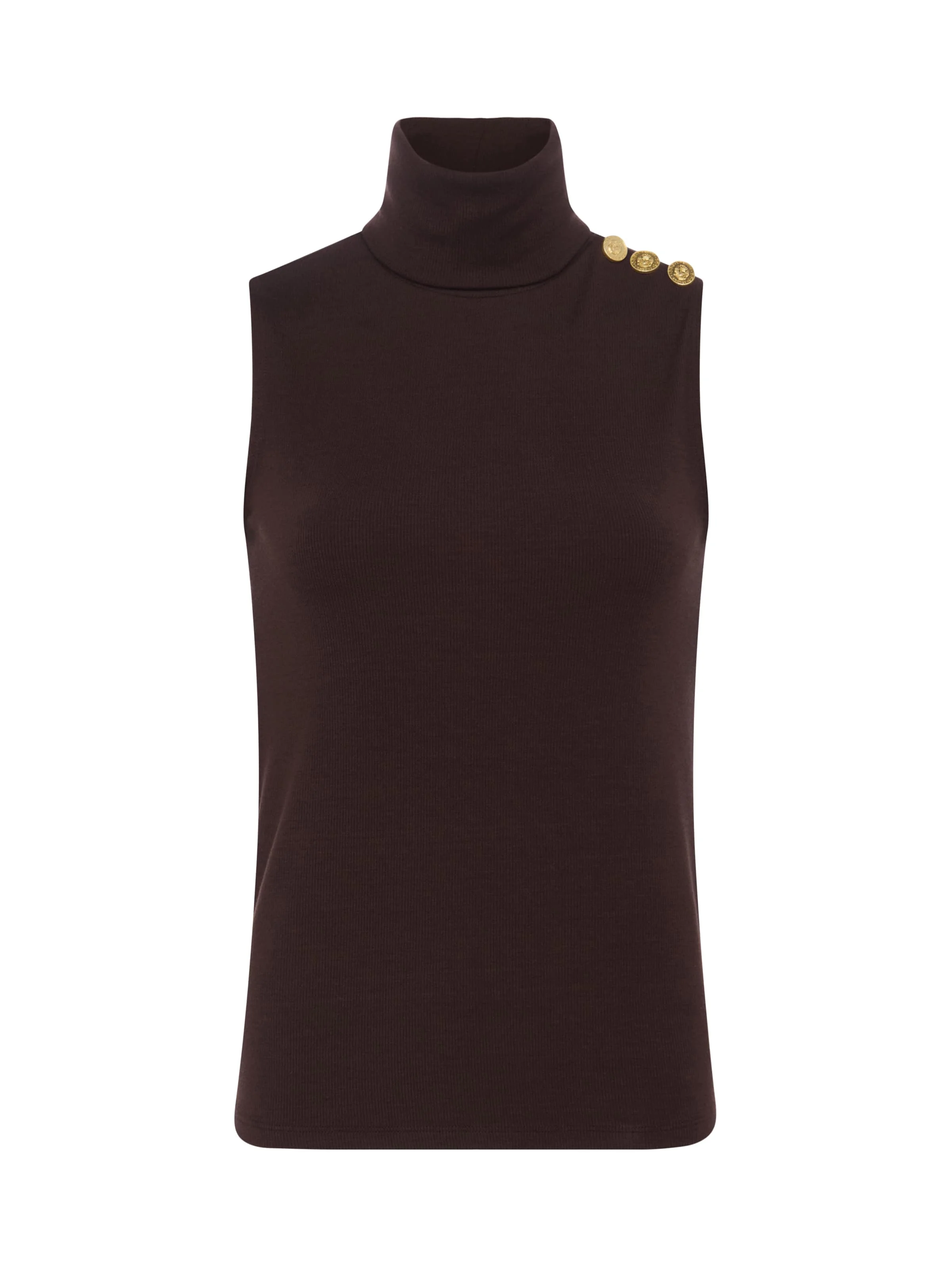 Layered or alone, Ceci is a versatile style you'll reach for time and time again. Button detail adds a glamorous element. Now in coffee brown. • Stretch rib • Slim fit • Decorative coin buttons Style No. 5561KMRZ-COFB DETAILS & FIT - About 23.5" From Shoulder to Hem MATERIALS & CARE Composition - 90% Modal 10% Spandex - Made in Los Angeles Care - Hand wash