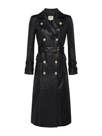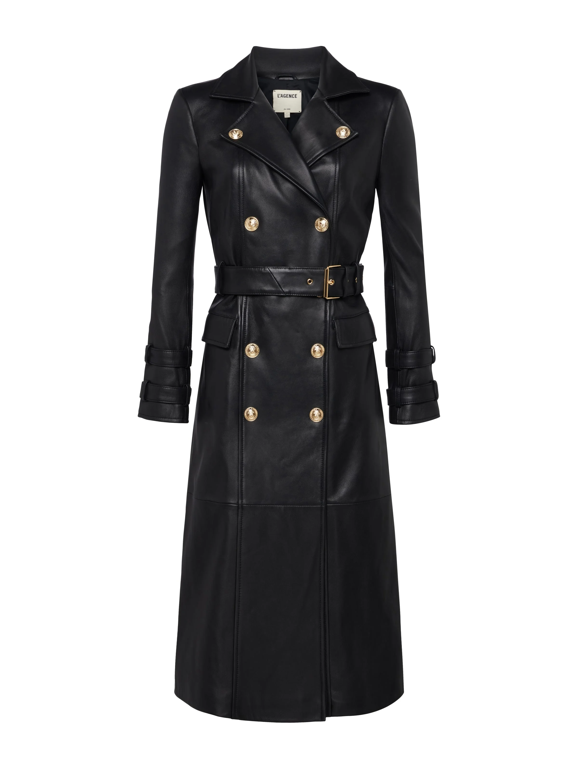A classic double-breasted trench coat in black leather. With a supple, buttery hand, premium leather style tapers from strong shoulder to waist then drapes in an A-line silhouette to hem. Includes double-belted sleeve with zipper trim, flapped welt pockets, gold embossed-dome accent buttons and detachable buckle belt. Front snap closure. Fully lined. Style No. 1737MLL-BLAC DETAILS & FIT - Model Details: Height 5' 8'’ | Bust 32” | Waist 23" | Hips 34” | Wearing Size XS - About 46.5" From Shoulder to Hem - Sleeve Length: 23.8" MATERIALS & CARE Composition - 100% Lambskin - Imported Care - Dry clean only with leather professional - Do not wash - Do not use bleach - Do not tumble dry - Do not iron - Color transfer or crocking may occur and is especially common with dyed leather