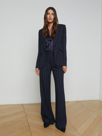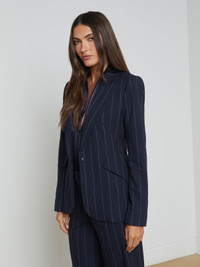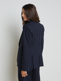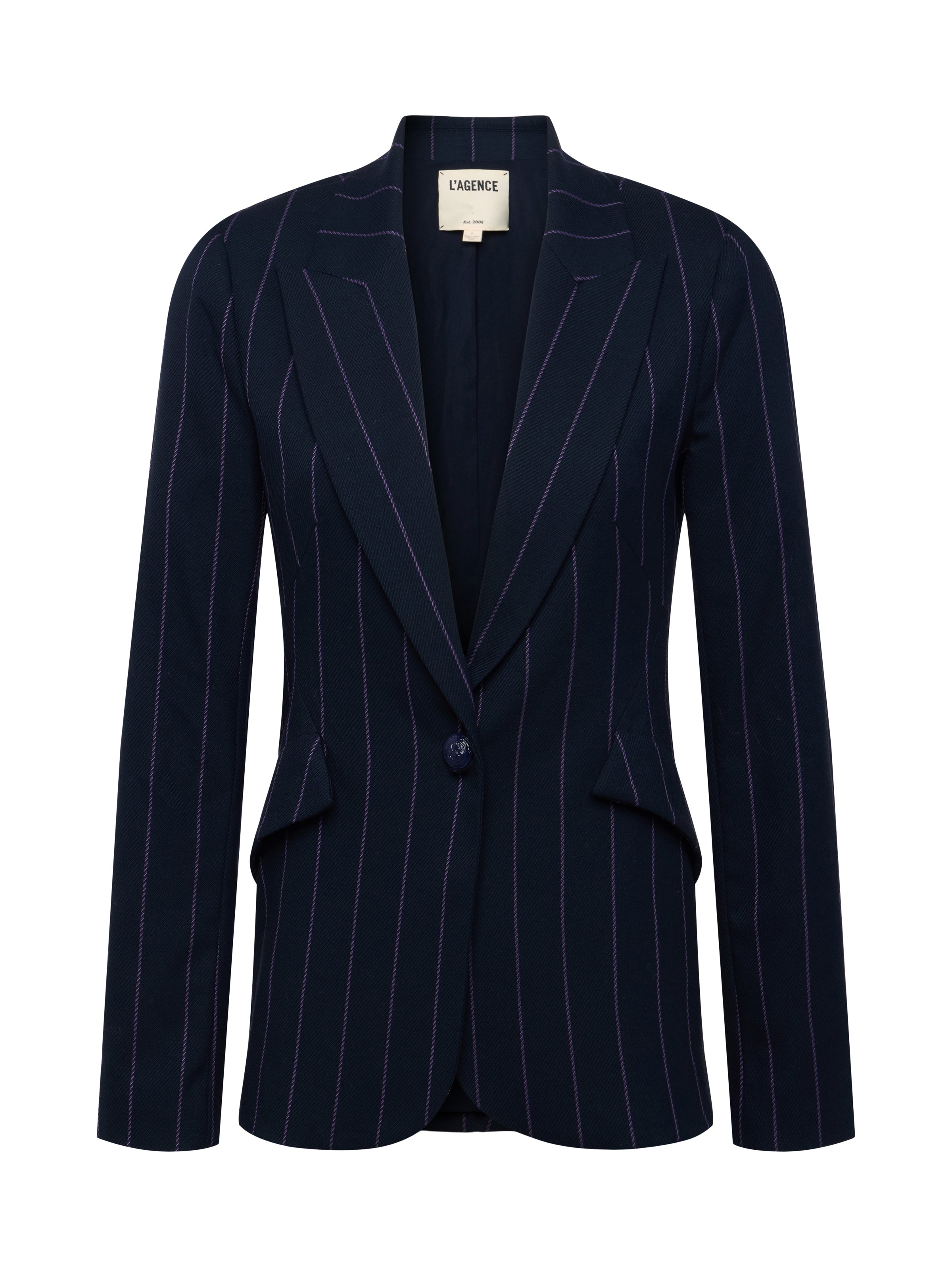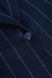 The ultimate single-breasted blazer, now in a luxurious Italian twill accented with purple pinstripes. • Italian twill suiting fabric • Fully lined • Strong shoulders • 2-button cuffs • Single-breasted embossed dome button closure • Flap pockets • Back vents Style No. 1377RVY-MLPP DETAILS & FIT - Model Details: Height 5'10" | Bust 32" | Waist 24" | Hips 34.5" | Wearing Size 2 - About 27.25" From Shoulder to Hem - Sleeve Length: 24.75" MATERIALS & CARE Composition - 63% Polyester 34% Rayon 3% Spandex - Imported