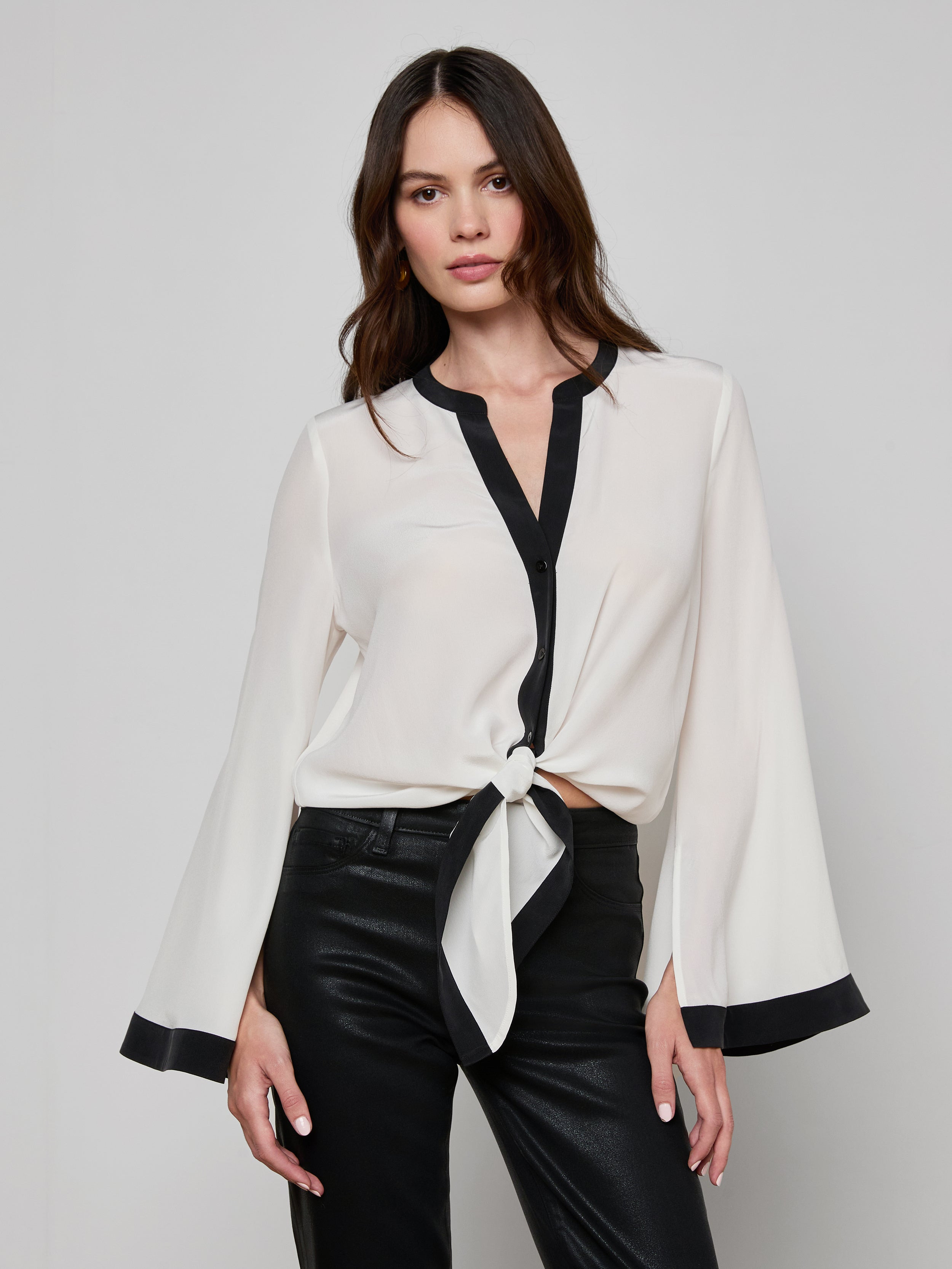Style No. S40473CDC-IVBL DETAILS & FIT - Model Details: Height 5'9" | Bust 32" | Waist 24" | Hips 34" | Wearing Size XS - About 20.2" From Shoulder to Hem - Sleeve Length: 23.5" MATERIALS & CARE Composition - 100% Silk - Imported Care - Dry clean only - Do not wash - No bleach - No tumble dry - Low iron if needed