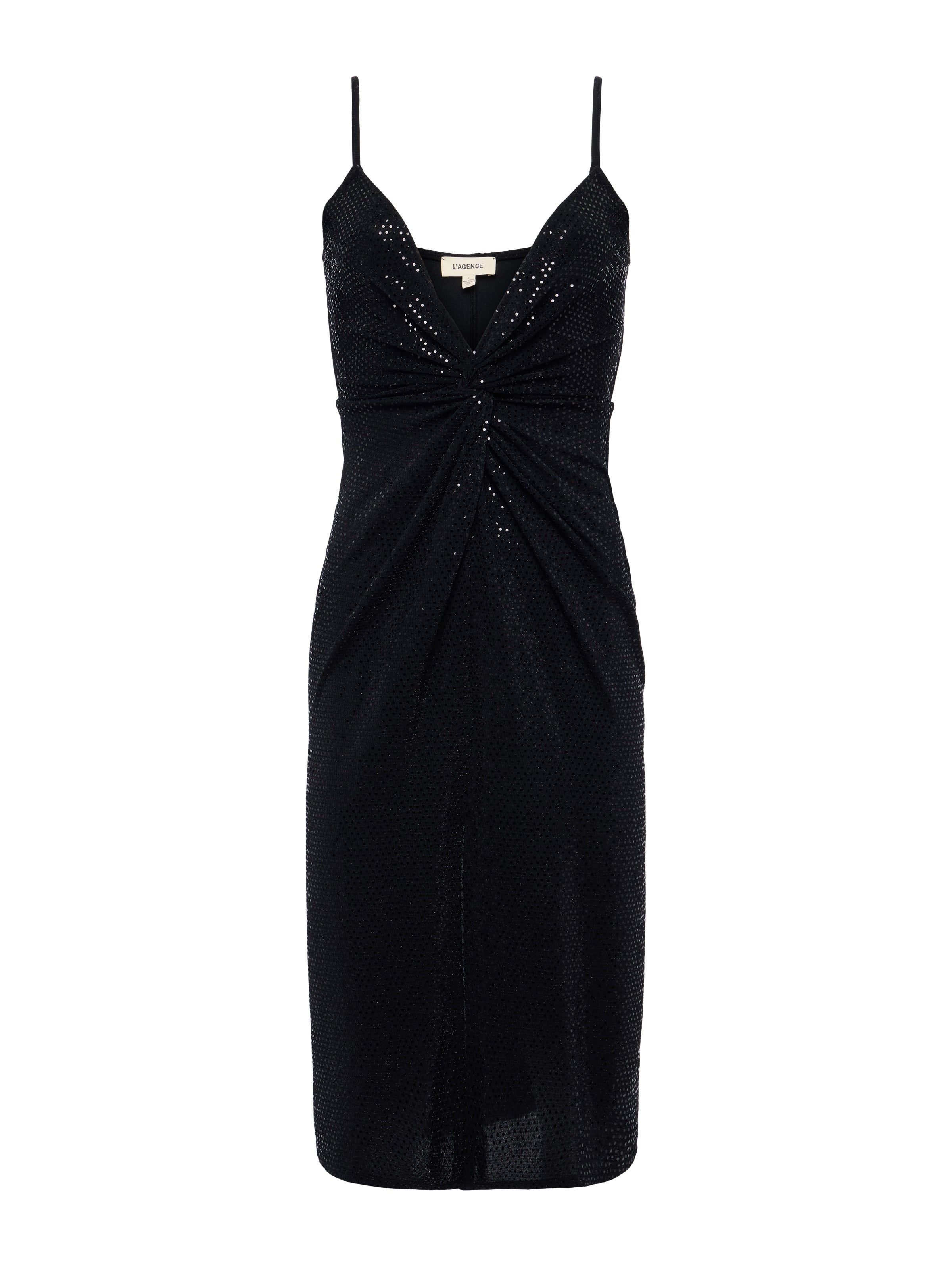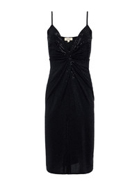 The Chatou is your answer to nighttime glamour. A plunging neckline and subtle sparkle command instant attention. • Sequined fabric • Adjustable straps • Twist front • Front slit • Midi length Style No. 61467WRA-BLAC DETAILS & FIT - Model Details: Height 5'9.5" | Bust 32" | Waist 24" | Hips 35" | Wearing Size 2 - About 39" From Shoulder to Hem MATERIALS & CARE Composition - 45% Nylon 45% Polyester 5% Metallic 5% Spandex - Imported
