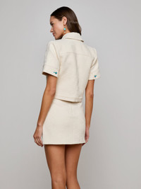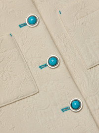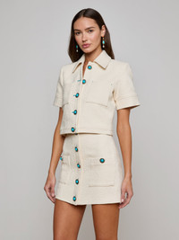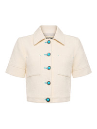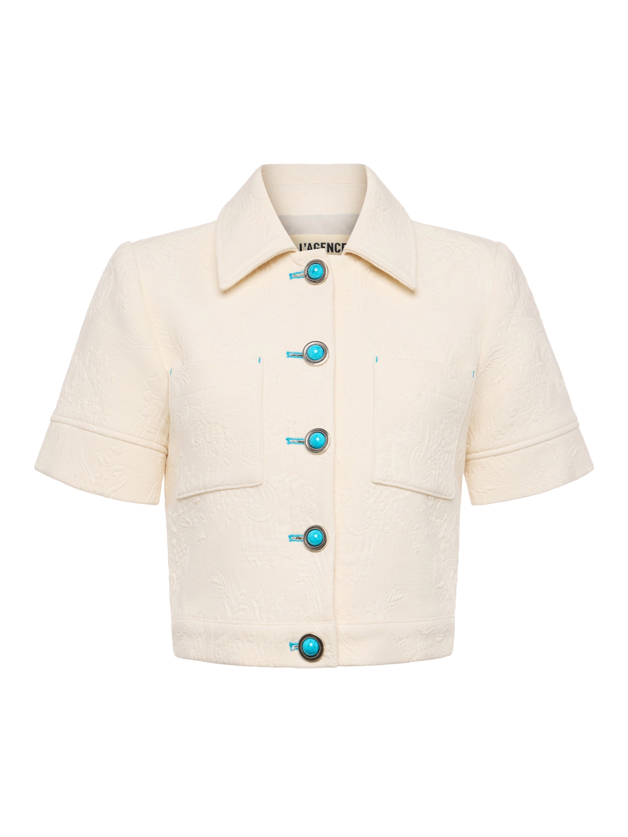 Classic, but make it fun. The Chita is a cropped, short-sleeved jacket crafted from a unique floral jacquard with texture and dimension. Turquoise buttons and topstitching add a pop of color. Wear alone or layered over a bodysuit. • Cotton floral jacquard • Patch pockets • Turquoise buttons Style No. 1927WCZ-IVOR DETAILS & FIT - Model Details: Height 5'10" | Bust 32" | Waist 23.5" | Hips 34.5" | Wearing Size 2 - About 19" From Shoulder to Hem - Sleeve Length: 9" MATERIALS & CARE Composition - 100% Cotton - Imported Care - Dry clean only