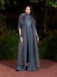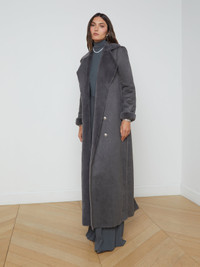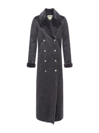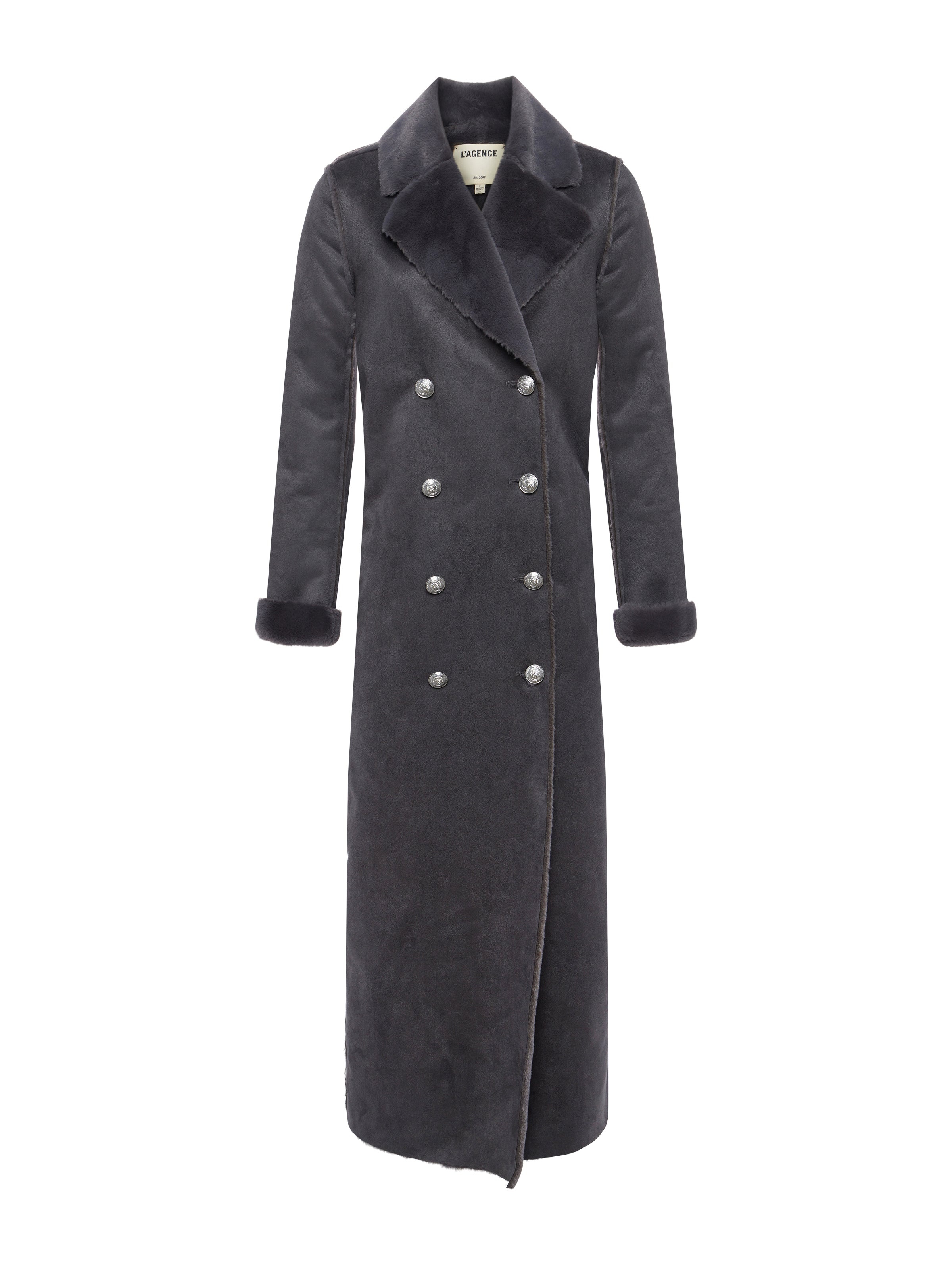 A classic silhouette cut from luxurious vegan shearling, offering full-length warmth. • Vegan shearling • Fully lined • Double-breasted style • Embossed dome button closure • Back vent Style No. 1828BWD-DKGR DETAILS & FIT - Model Details: Height 5'10" | Bust 32" | Waist 24'' | Hips 34.5'' | Wearing Size 2 - About 47.5" From Shoulder to Hem - Sleeve Length: 24" MATERIALS & CARE Composition - 100% Polyester - Imported Care - Machine wash cold separately gentle cycle - Do not bleach - Line dry - Do not iron or dry clean