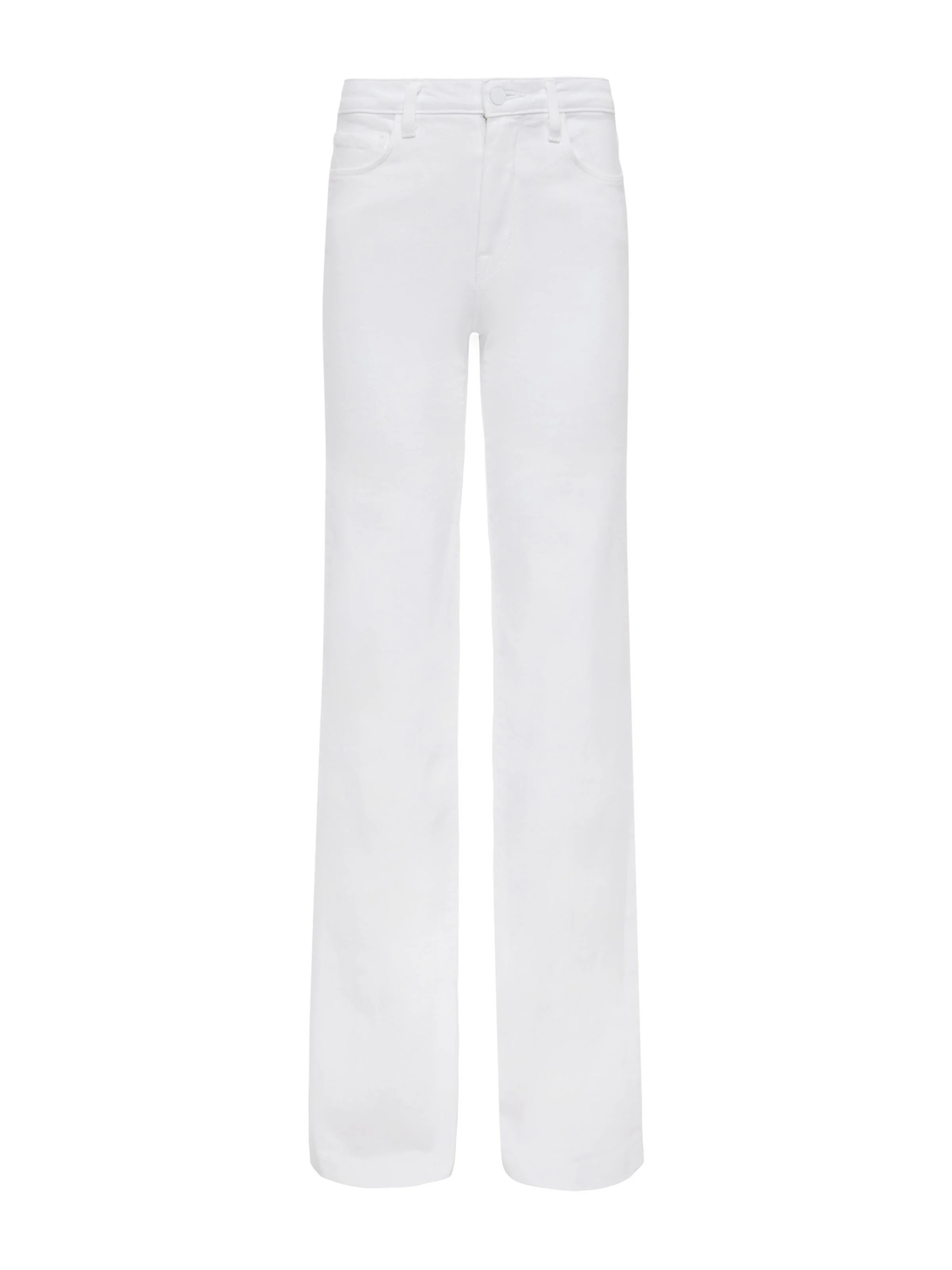 A beautifully proportioned wide-leg high-rise jean in white premium stretch denim. Contoured waistband fits securely at or below natural waist, while supple stretch denim hugs the hip before releasing into a wide leg. Classic five-pocket construction and front zip fly closure with tonal button. Style No. 2790KBO-BLAN DETAILS & FIT - Model Details: Height: 5'10" | Bust: 32" | Waist: 24'' | Hips: 34.5'' | Wearing Size 25 - Rise: 10" - Inseam: 35" - Leg Opening: 20" MATERIALS & CARE Composition - 98% Cotton 2% Spandex - Made in Los Angeles Care - Machine wash