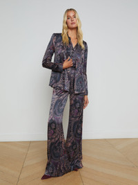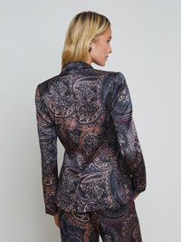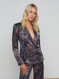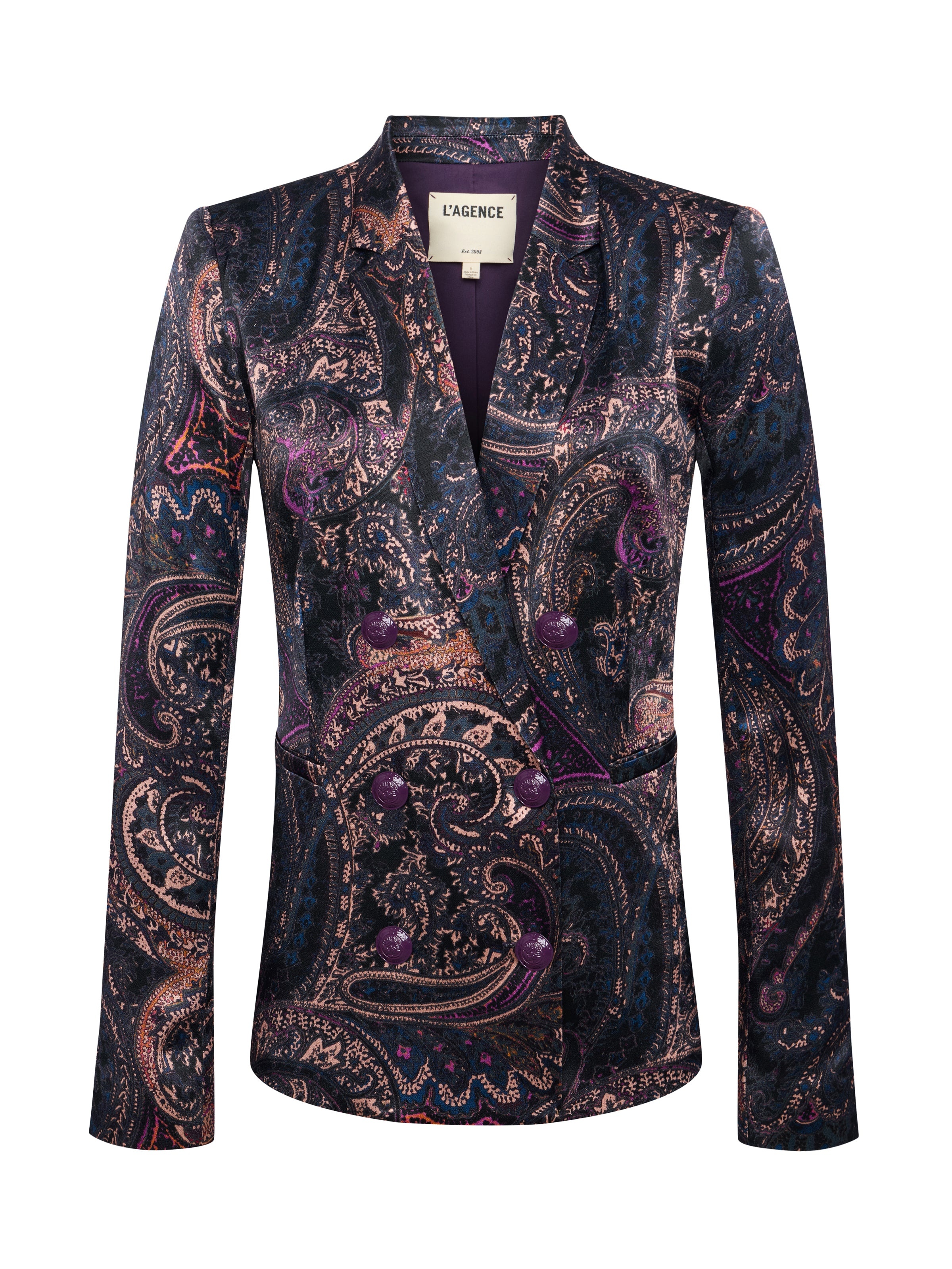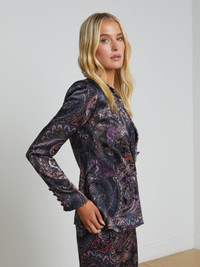 Subtle feminine shaping balances the crisp tailored details of the timeless Colin blazer. Now back in a midnight paisley with notes of plum. • Lightweight satin fabric • Fully lined • Double-breasted style • Strong shoulders • Welt pockets • Back vent • 4-button cuffs • Embossed dome buttons Style No. 1485PHY-PMBP DETAILS & FIT - Model Details: Height 5'9" | Bust 32" | Waist 24" | Hips 34" | Wearing Size 2 - About 26.75" From Shoulder to Hem - Sleeve Length: 24.3" MATERIALS & CARE Composition - 58% Viscose 42% Rayon - Imported
