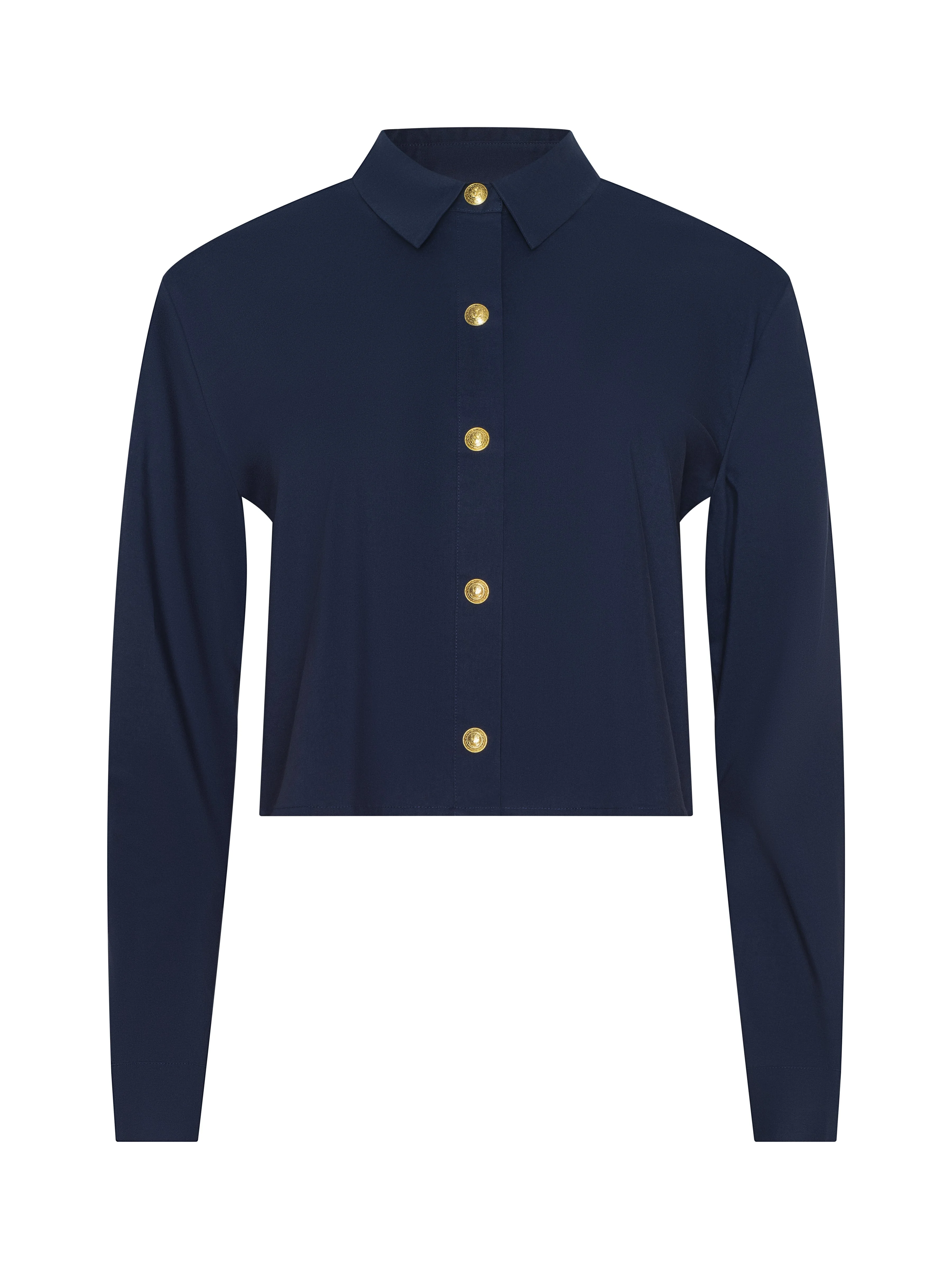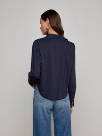 A classic button-down shirt with a cool, borrowed-from-the-boys fit and a touch of glamour. Now in midnight. • Organic cotton poplin • High-low hem • Front snap button closures • Cropped length Style No. 40548NPO2-MDNT DETAILS & FIT - Model Details: Height 5'10" | Bust 32" | Waist 23.5" | Hips 34.5"| Wearing Size XS - About 19.6" From Shoulder to Hem - Sleeve Length: 23.25" MATERIALS & CARE Composition - 76% Cotton 22% Polyester 2% Elastane - Imported