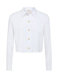 A classic button-down shirt with a cool, borrowed-from-the-boys fit and a touch of glamour. Now in white and gold. • Organic cotton poplin • High-low hem • Snap button closures • Cropped length Style No. 40548NPO2-WHGD DETAILS & FIT - About 19.6" From Shoulder to Hem - Sleeve Length: 23.25" MATERIALS & CARE Composition - 76% Organic Cotton 22% Polyester 2% Elastane - Imported