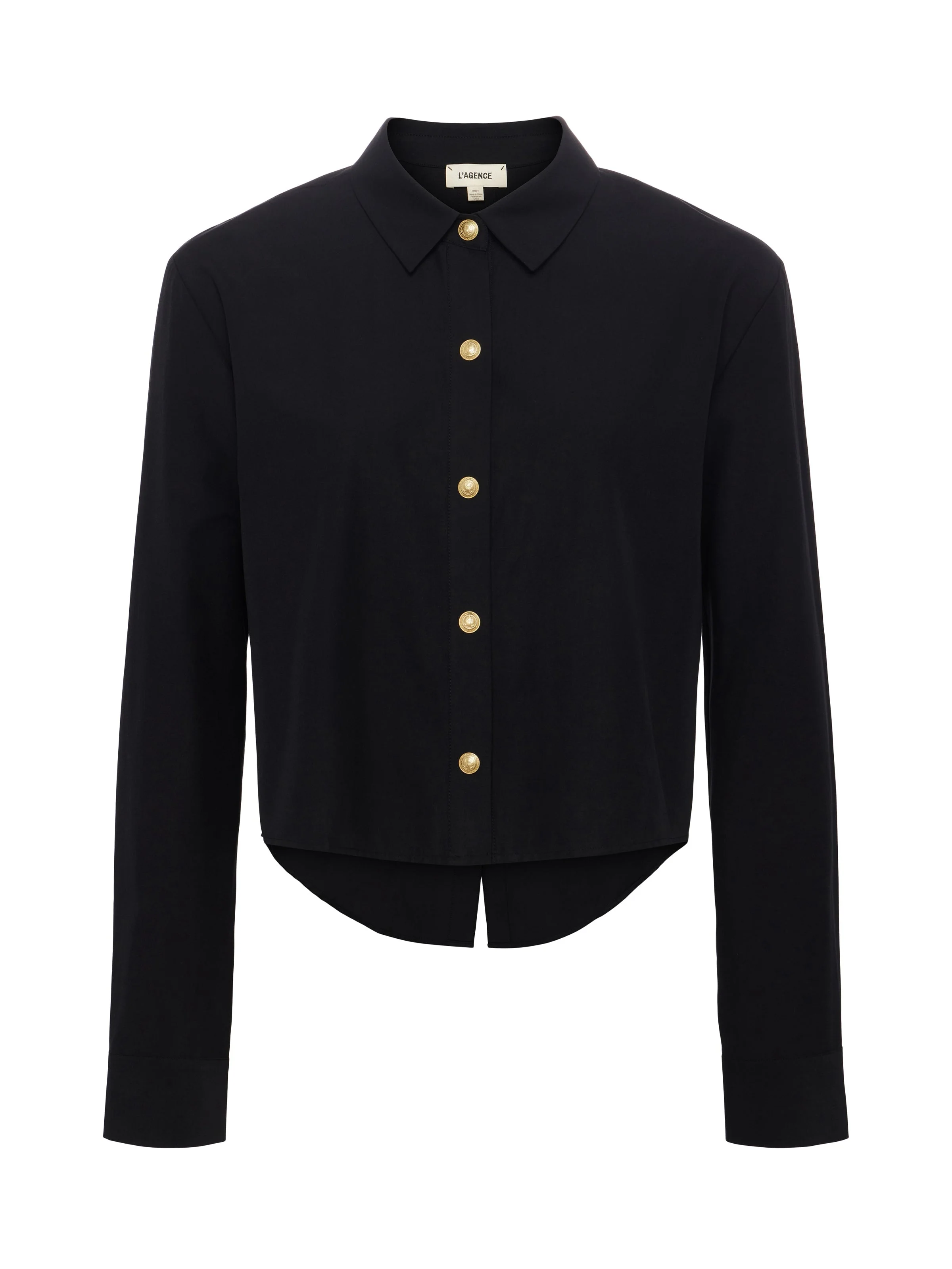 A classic button-down shirt with a cool, borrowed-from-the-boys fit and a touch of glamour. • Stretch cotton-blend fabric • High low hem • Front snap closures • Mini dome buttons • Cropped length Style No. 40548NPO-BLGO DETAILS & FIT - Model Details: Height 5'10" | Bust 32" | Waist 24'' | Hips 34.5'' | Wearing Size XS - About 19.5" From Shoulder to Hem - Sleeve Length: 23.25" MATERIALS & CARE Composition - 76% Cotton 22% Polyester 2% Elastane - Imported Care - Dry clean only - Do not wash - No bleach - No tumble dry - Low iron if needed
