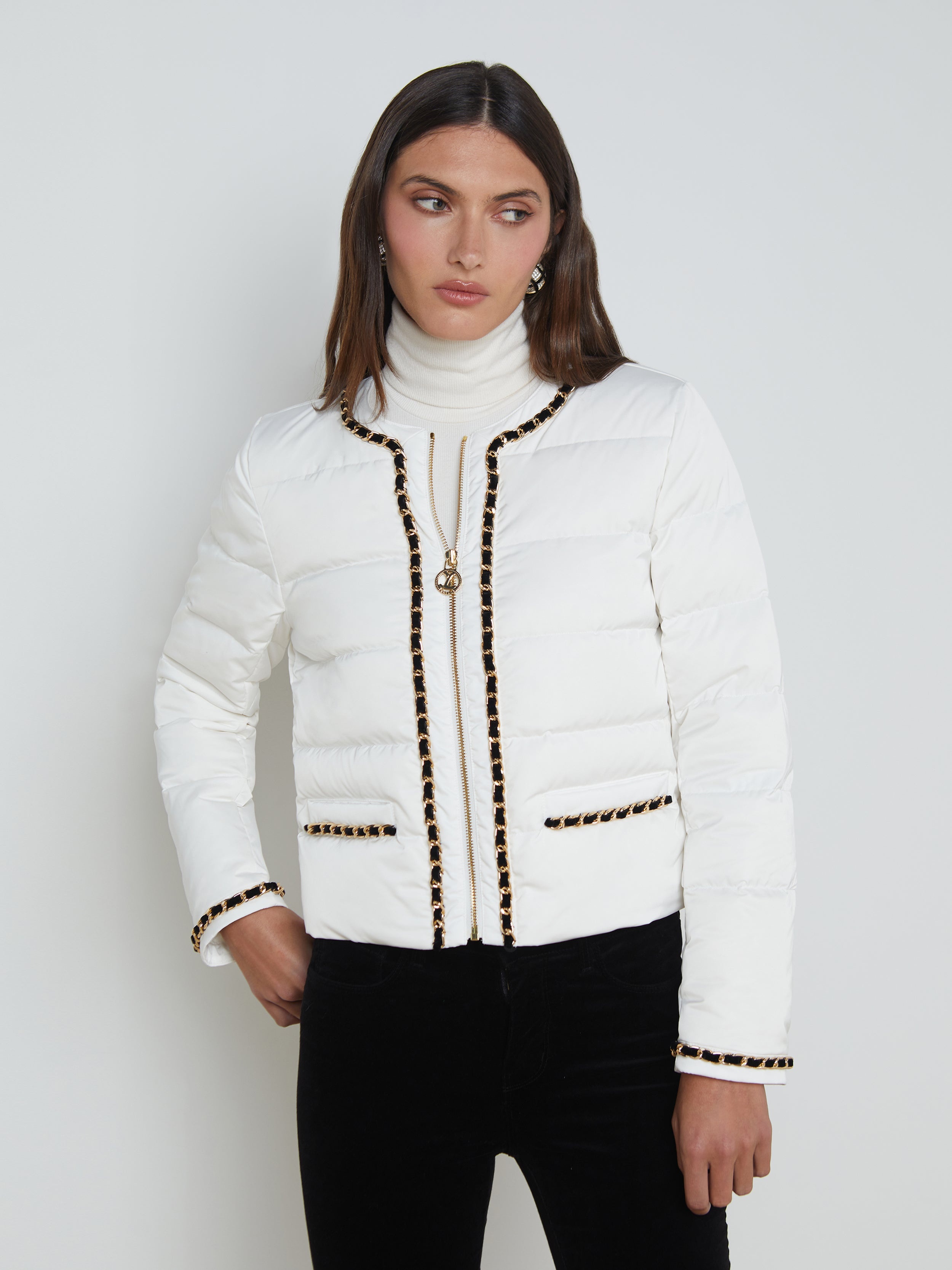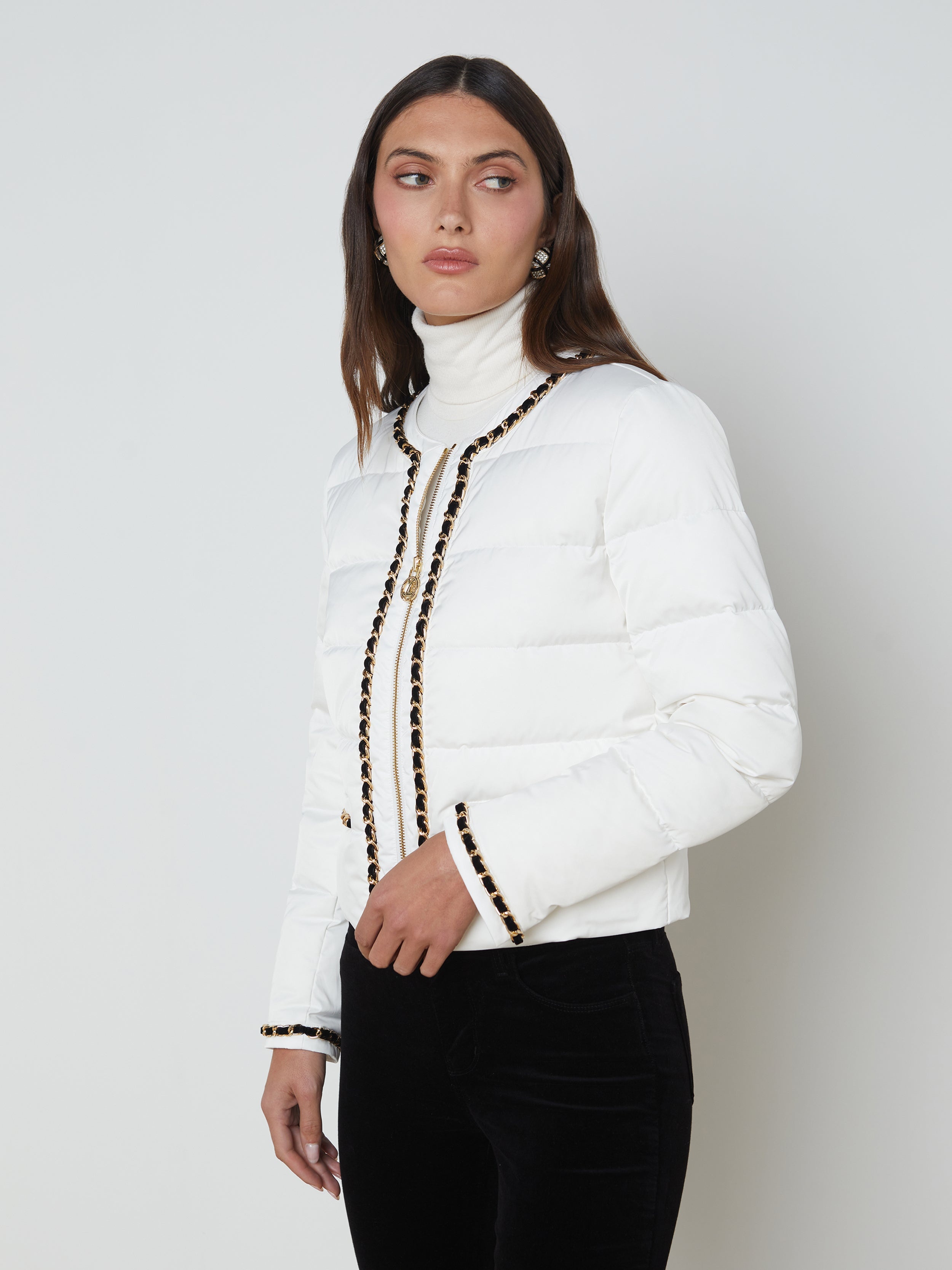 The look of a chic jacket with the warmth of a puffer. Now in versatile white with contrast trim. • 90% down, 10% feather fill • Decorative ribbon-threaded chain • Front welt pockets • L'AGENCE zip pull • Front zip closure Style No. 1879LNP-WHIT DETAILS & FIT - Model Details: Height 5'10" | Bust 32" | Waist 24'' | Hips 34.5'' | Wearing Size XS - About 21" From Shoulder to Hem - Sleeve Length: 23.5" MATERIALS & CARE Composition - 100% Polyester - Imported Care - Hand wash cold - Do not bleach - Do not tumble dry - Do not iron - Do not dry clean