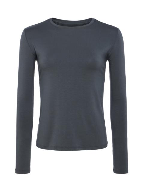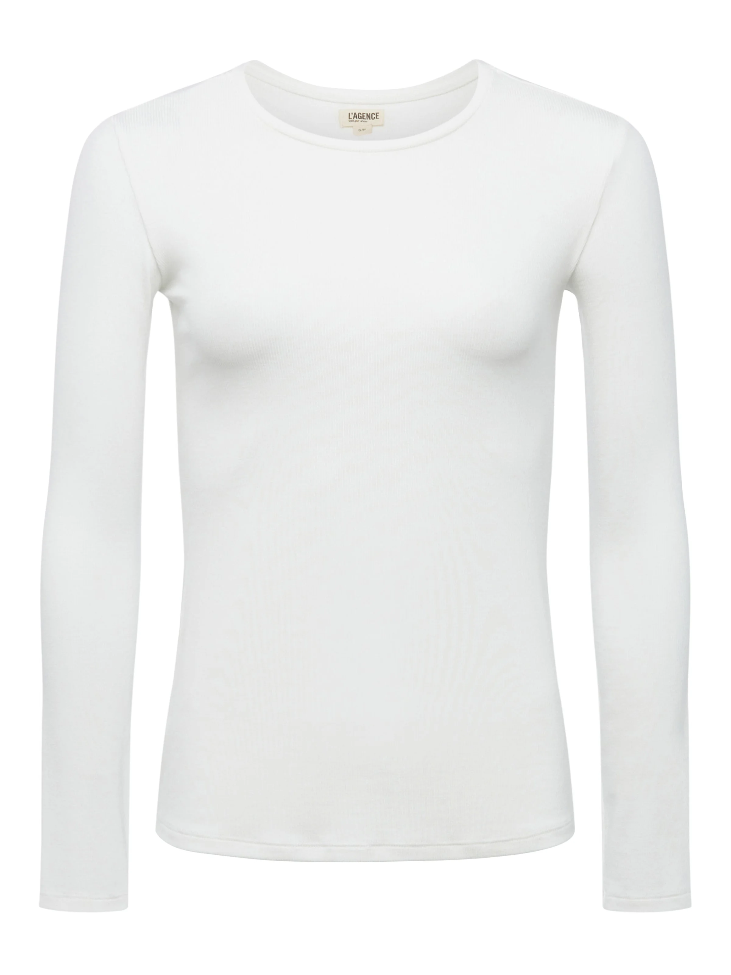 Modern and elegant slim-fit top in white. Ultra-soft microfiber jersey has a luxuriously silky hand and clings lightly to the figure. Look includes crew neck and sleek long sleeves. Beautiful wardrobe stable that works on its own or as a base layering piece. Style No. 5491MJT-WHIT DETAILS & FIT - Model Details: Height: 5’10" | Bust 34” | Waist 24" | Hips 35” | Wearing Size XS - About 25.75" From Shoulder to Hem - Sleeve Length: 23.75" MATERIALS & CARE Composition - 93% Rayon 7% Spandex - Made in Los Angeles Care - Hand wash