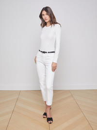 Modern and elegant slim-fit top in pure white. Ultra-soft ribbed micro modal has a luxuriously silky hand and clings lightly to the figure. Look includes crew neck and sleek long sleeves. Beautiful wardrobe stable that works on its own or as a base layering piece. Style No. 5491MMS-WHIT DETAILS & FIT - Model Details: Height: 5'10" | Bust: 32" | Waist: 24'' | Hips: 34.5'' | Wearing Size XS - About 25.75" From Shoulder to Hem - Sleeve Length: 23.75" - Constructed of Materials MATERIALS & CARE Composition - 95% Micro Modal 5% Spandex - Constructed of Imported Materials Care - Hand wash