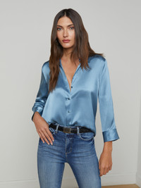 Meet the iconic silk button-down that belongs in every wardrobe. Our signature three-quarter sleeve shirt is back in a lovely blue mist. • 100% silk charmeuse • Slim fit • 3/4 sleeves • High-low shirttail hem • Front button closure Style No. 40126CLW-BUMI DETAILS & FIT - Model Details: Height 5'10" | Bust 32" | Waist 24" | Hips 34.5" | Wearing Size XS - About 26" From Shoulder to Hem - Sleeve Length: 19.2" MATERIALS & CARE Composition - 100% Silk - Imported Care - Dry clean only - Do not wash - No bleach - No tumble dry - Low iron if needed
