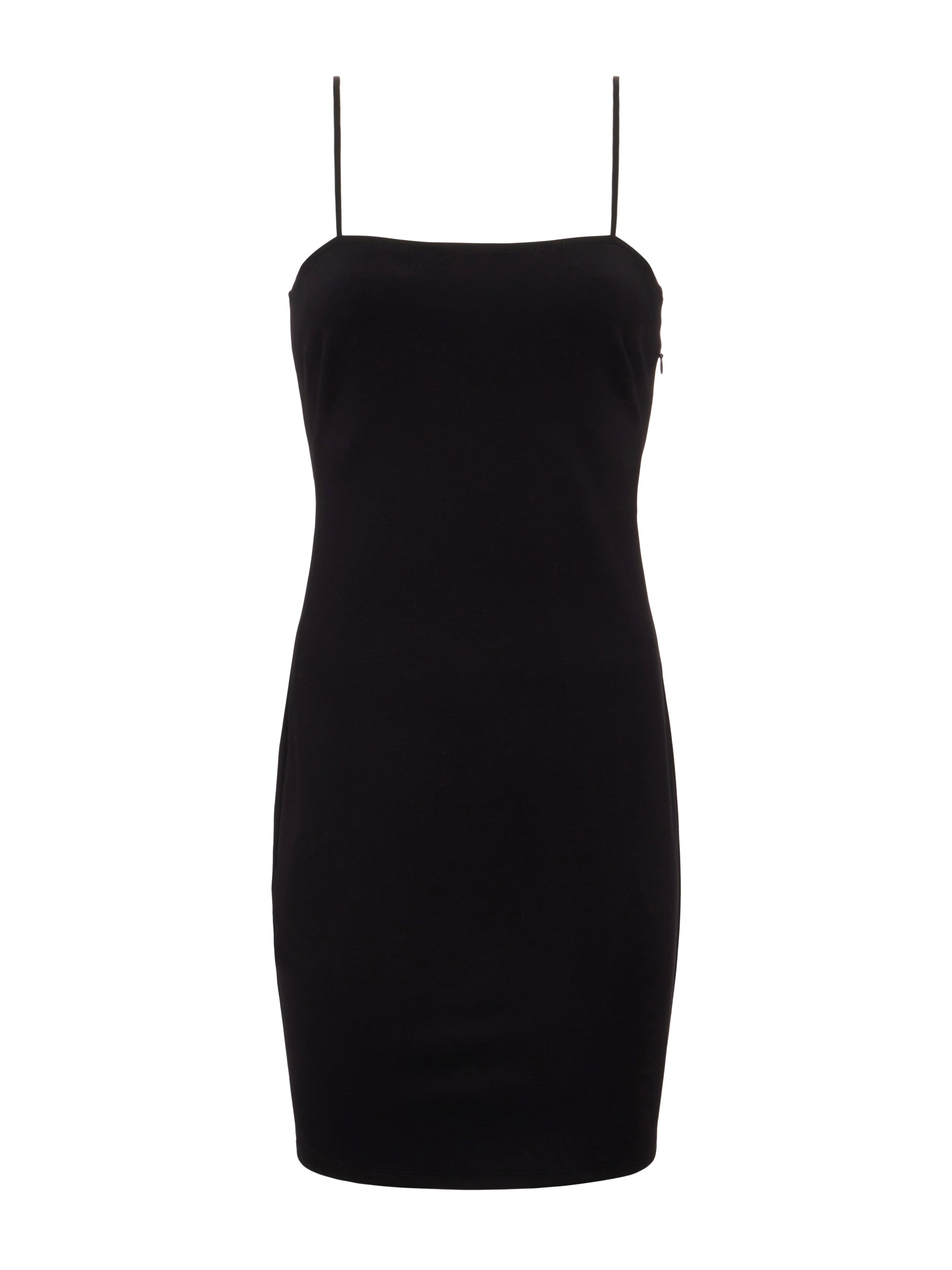 The little black dress, in modern, minimalist form. • Stretch ponte fabric • Mini length • Adjustable straps • Invisible side zipper Style No. 61471APT-BLAC DETAILS & FIT - Model Details: Height 5'10" | Bust 32" | Waist 24'' | Hips 34.5'' | Wearing Size XS - About 33.5" From Shoulder to Hem MATERIALS & CARE Composition - 82% Viscose 14% Nylon 4% Spandex - Made in Los Angeles Care - Machine wash
