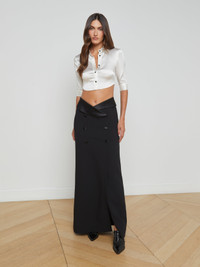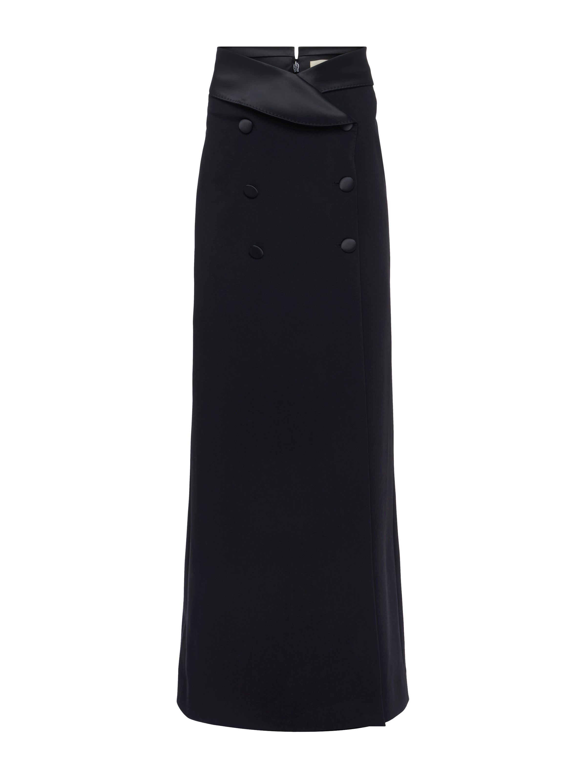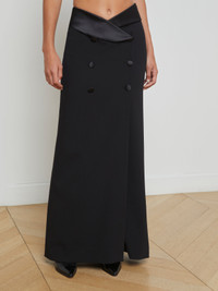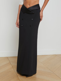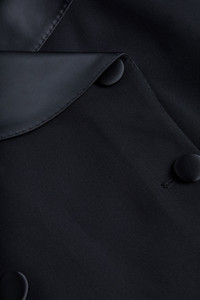 Inspired by the look of a blazer worn around the waist, the Diara combines a subtle mermaid silhouette with tuxedo-inspired details. • Italian suiting fabric with mechanical stretch • Satin lapel waistband with decorative stitching • Front satin buttons, 1 functional • Floor length • Back invisible zip closure Style No. 3423PMB-BLAC DETAILS & FIT - Model Details: Height 5'10" | Bust 32" | Waist 24'' | Hips 34.5'' | Wearing Size 2 - About 43.25" From Shoulder to Hem MATERIALS & CARE Composition - 73% Polyester 20% Viscose 7% Spandex - Imported Care - Dry clean only