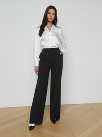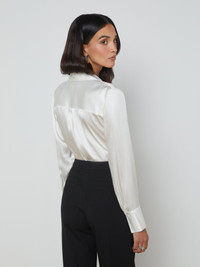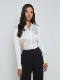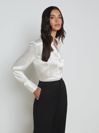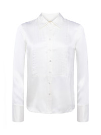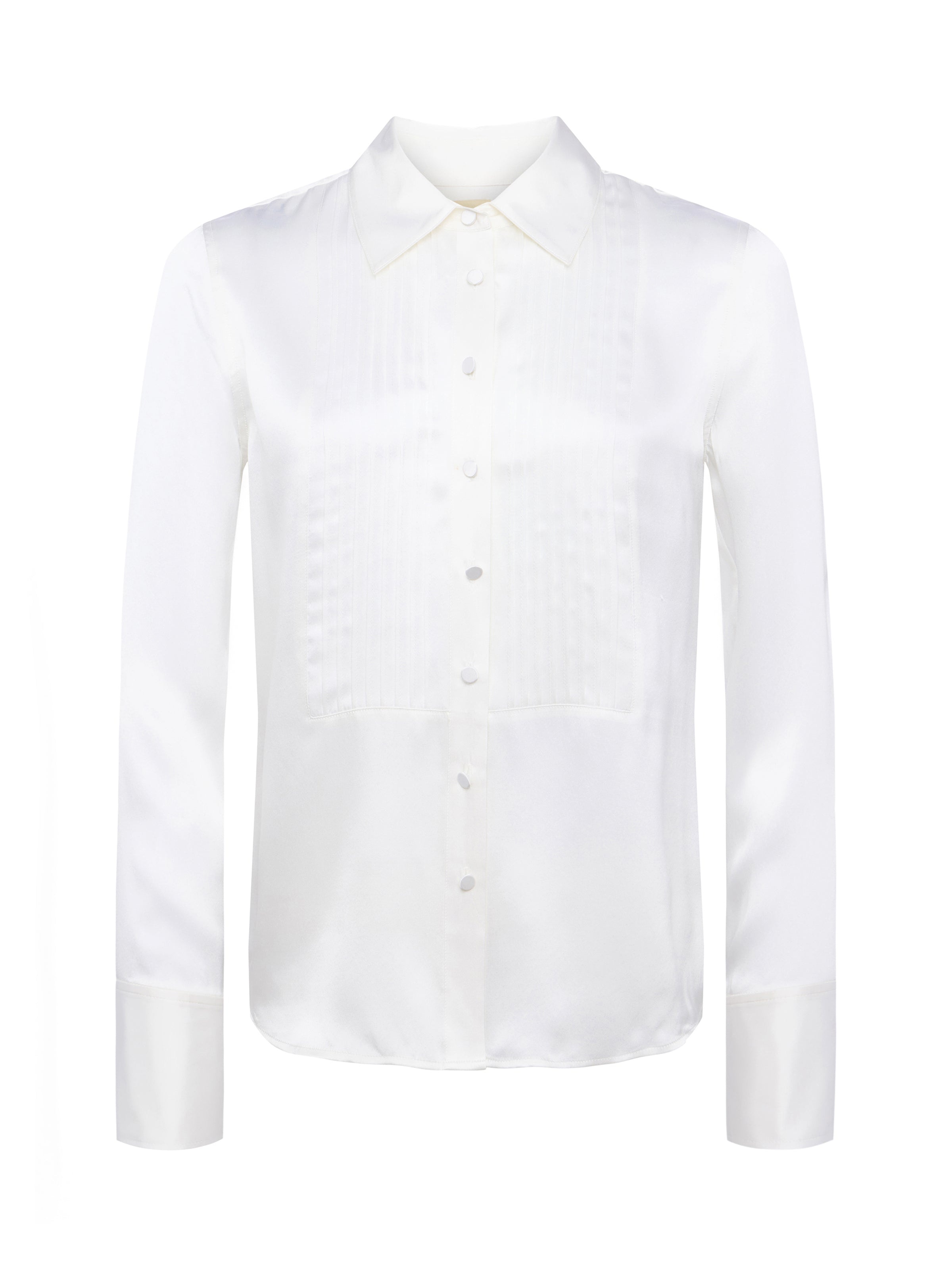 Meet the feminine version of the classic tuxedo shirt, crafted with lustrous silk charmeuse. • 100% silk charmeuse • Front pintuck bib • Unlined • 1-button cuffs • Front satin-covered button closures Style No. 40663CLW-WHIT DETAILS & FIT - Model Details: Height 5'9.5" | Bust 32" | Waist 24" | Hips 35" | Wearing Size XS - About 25.6" From Shoulder to Hem - Sleeve Length: 24" MATERIALS & CARE Composition - 100% Silk - Imported Care - Dry clean only - Do not wash - No bleach - No tumble dry - Low iron if needed