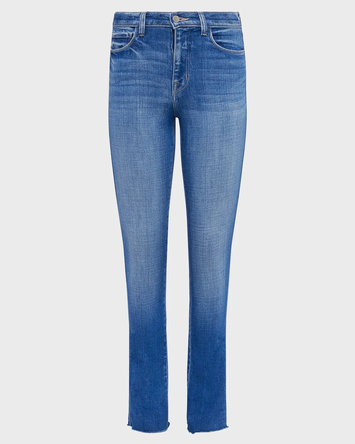 L'Agence "Draya" straightleg jeans with a raw hem in mediumwash denim Approx. 32" inseam Fivepocket style High rise Slim fit Ankle length Button/zip fly; belt loops Cotton/spandex Dry clean Made in USA