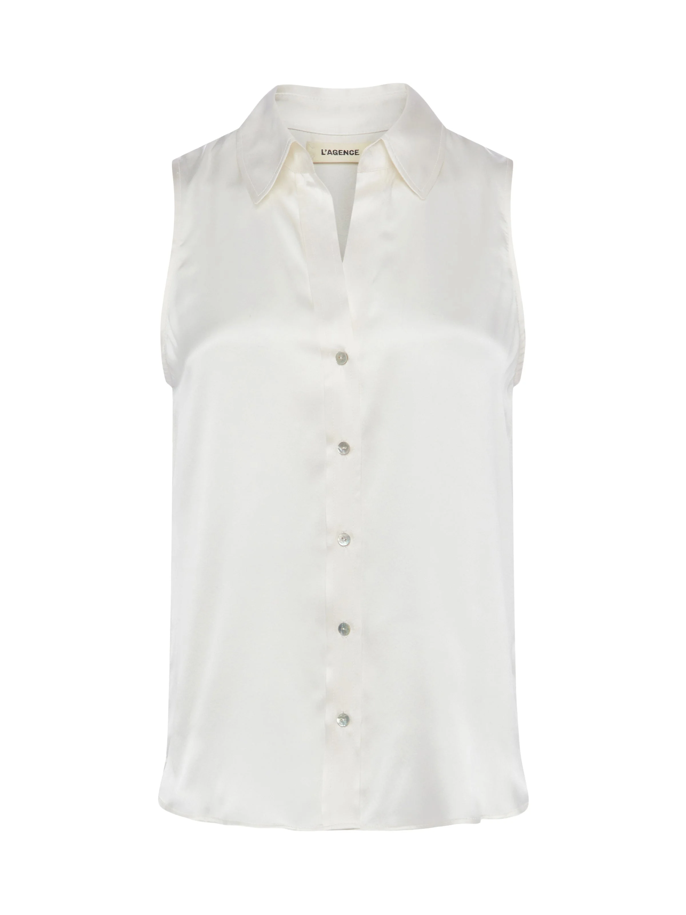 An essential sleeveless blouse in ivory silk. Relaxed-fit style has classic shirting details like smart collar, back yoke with loop, and shirttail hem. Luxe mother-of-pearl button closure. 100% Silk. Style No. 40542CLW-IVOR DETAILS & FIT - Model Details: Height: 5'10" | Bust: 32" | Waist: 24'' | Hips: 34.5'' | Wearing Size XS - About 26" From Shoulder to Hem MATERIALS & CARE Composition - 100% Silk - Imported Care - Dry clean only - Do not wash - No bleach - No tumble dry - Low iron if needed
