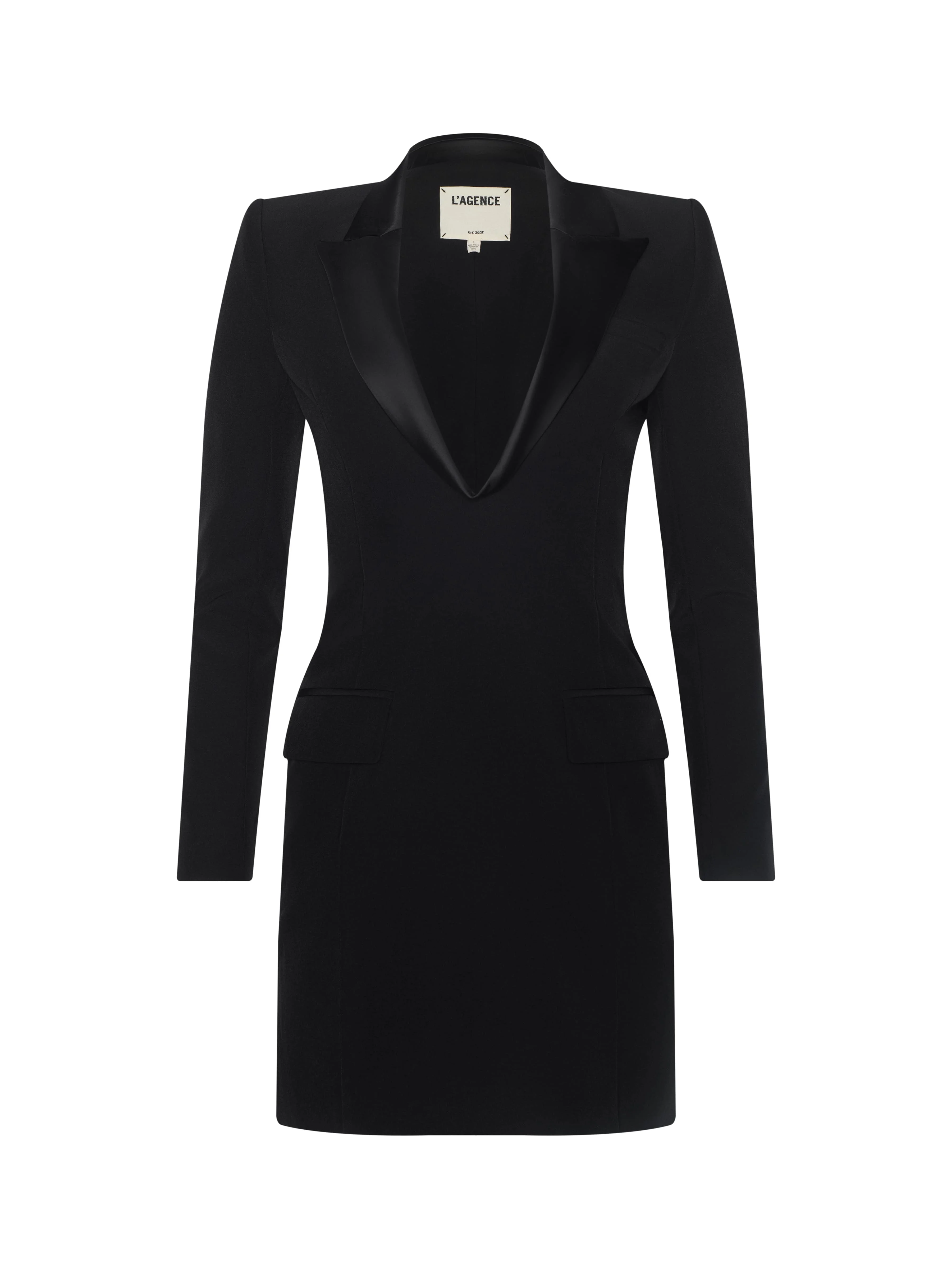 Style No. 61633SVE-BLAC DETAILS & FIT - Model Details: Height 5'10" | Bust 32" | Waist 23.5" | Hips 34.5" | Wearing Size 2 - About 34.75" From Shoulder to Hem - Sleeve Length: 23.75" MATERIALS & CARE Composition - 92% Polyester 8% Spandex - Imported Care - Dry clean only - Cover button with foil paper - Do not wash - No bleach - No tumble dry