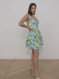 Channel Italian glamour in the drop waist Jai dress, designed with a fit-and-flare silhouette. Soft pleats add playful movement. Now in a vacation-ready floral lemon print. • Structured poplin • Lined • Underwire cups, padded for coverage • Smocked back panel • Invisible back zip Style No. 61538LFL-YYSH DETAILS & FIT - Model Details: Height 5'9" | Bust 32" | Waist 24" | Hips 34" | Wearing Size 2 - About 34.75" From Top to Hem MATERIALS & CARE Composition - 62% Lyocell 38% Cotton - Imported Care - Hand wash gentle in cold water - Do not tumble dry - Do not bleach - Do not wring - Cool iron if needed