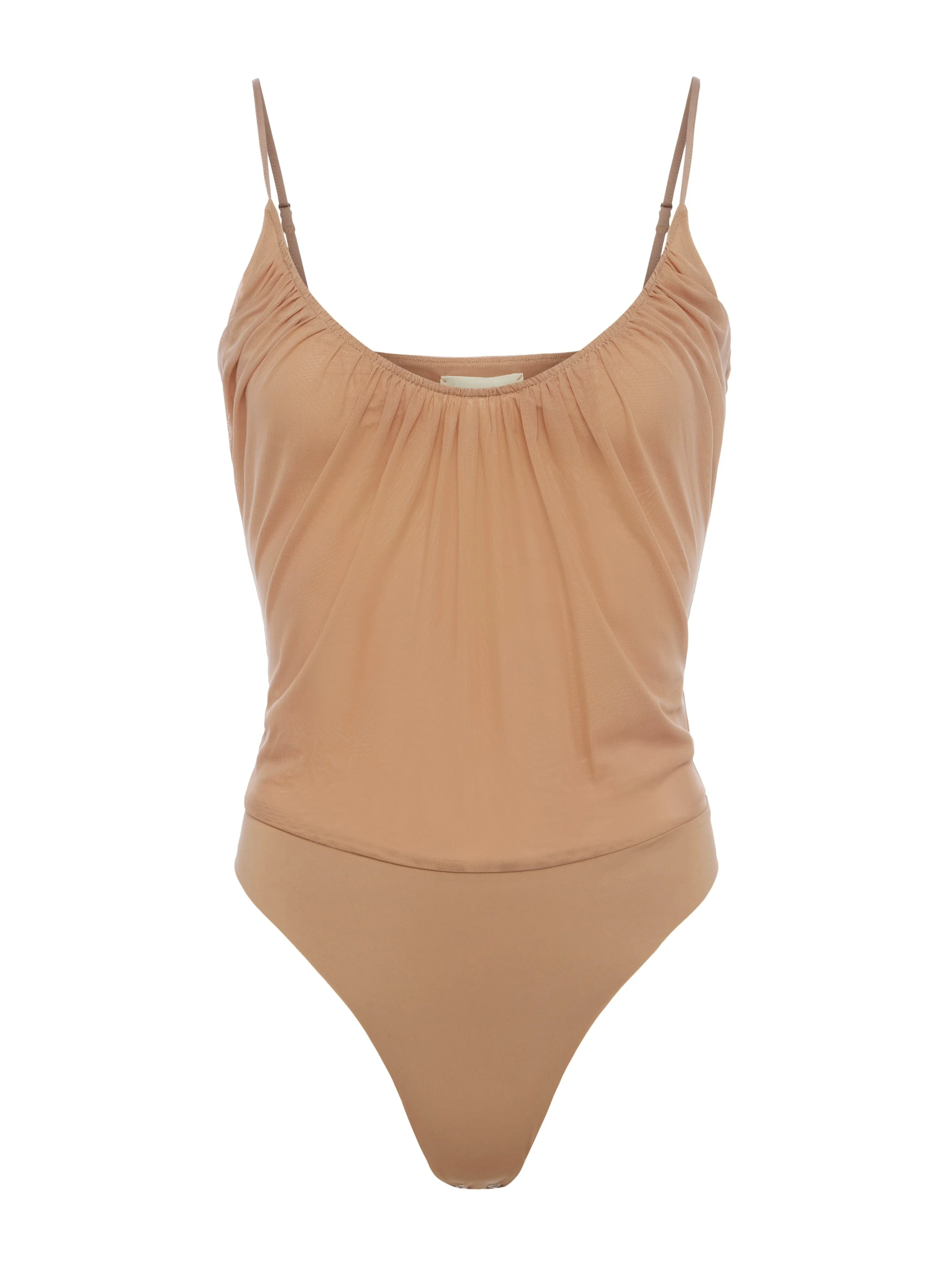 This subtly sexy bodysuit in light brown belongs in your wardrobe for all four seasons. Ruching adds feminine softness to a deep scoop-neckline. Adjustable straps allow for a fully customizable fit. Stunning on its own with slim denim. Layer under a full suit for a sharp office look. Style No. 40615PRM-DKCP DETAILS & FIT - Model Details: Height 5’9.5" | Bust 32" | Waist 24" | Hips 35" | Shoe 8 | Wearing Size XS - About 16.3" From Top to Waist MATERIALS & CARE Composition - 90% Nylon 10% Spandex - Imported Care - Dry clean only - Do not wash - No bleach - No tumble dry - Low iron if needed