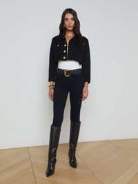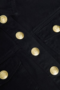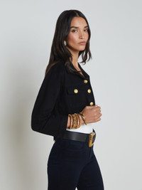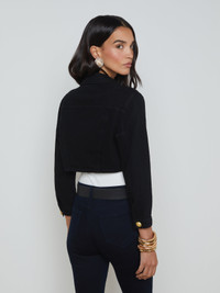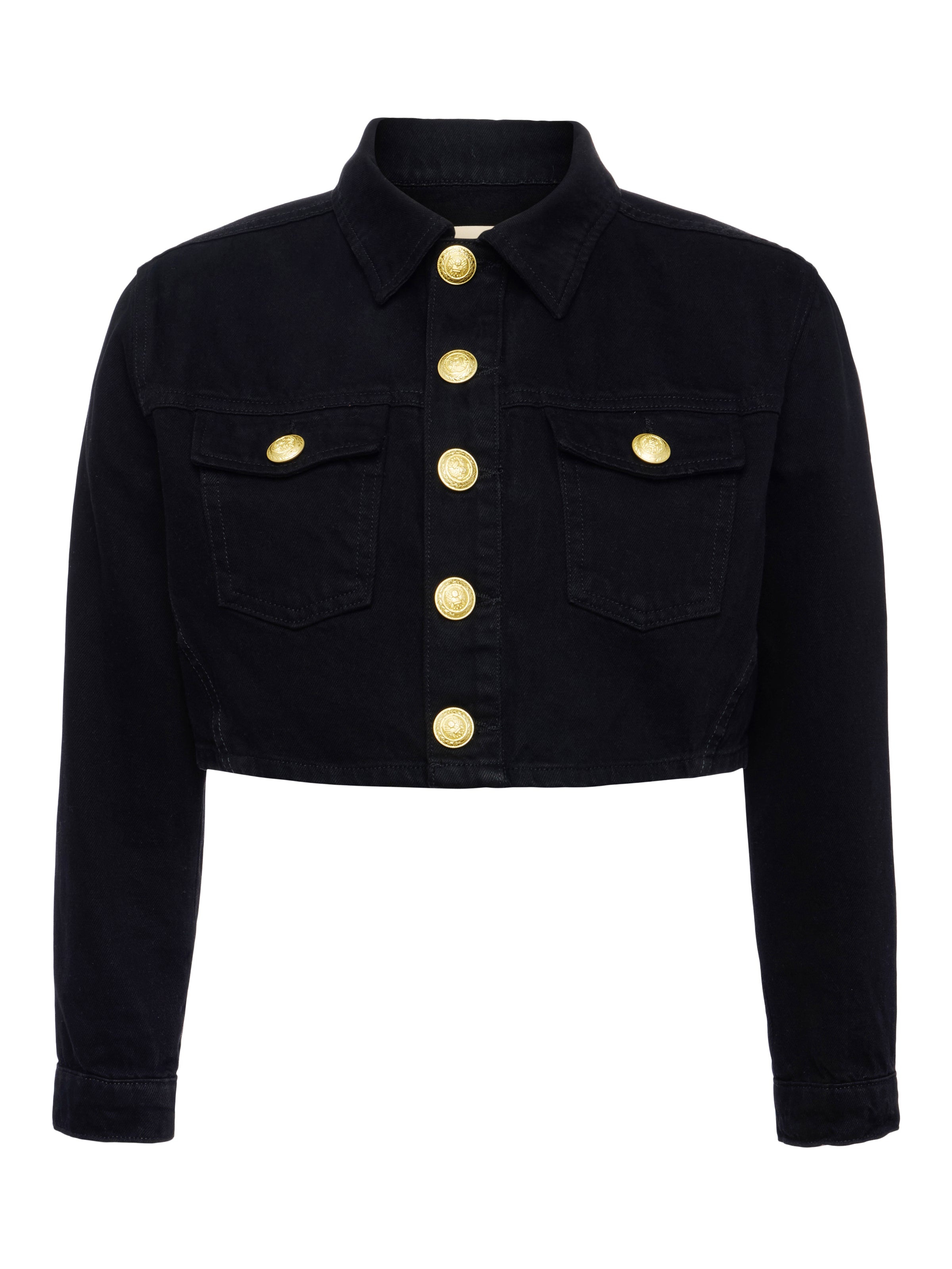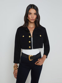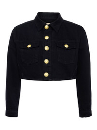 Our signature three-quarter sleeve jean jacket is reimagined in an ultra cropped cut, now in a saturated black wash. Embossed dome buttons add a pop of glamor. • Yarn-dyed all-cotton denim • Cropped length • Button flap patch pockets • Three-quarter sleeves • 1-button cuffs • Front embossed dome button closures Style No. 1882YRO-NOIR DETAILS & FIT - Model Details: Height 5'9.5" | Bust 32" | Waist 24" | Hips 35" | Wearing Size XS - About 15" From Shoulder to Hem - Sleeve Length: 20" MATERIALS & CARE Composition - 100% Cotton - Made in Los Angeles