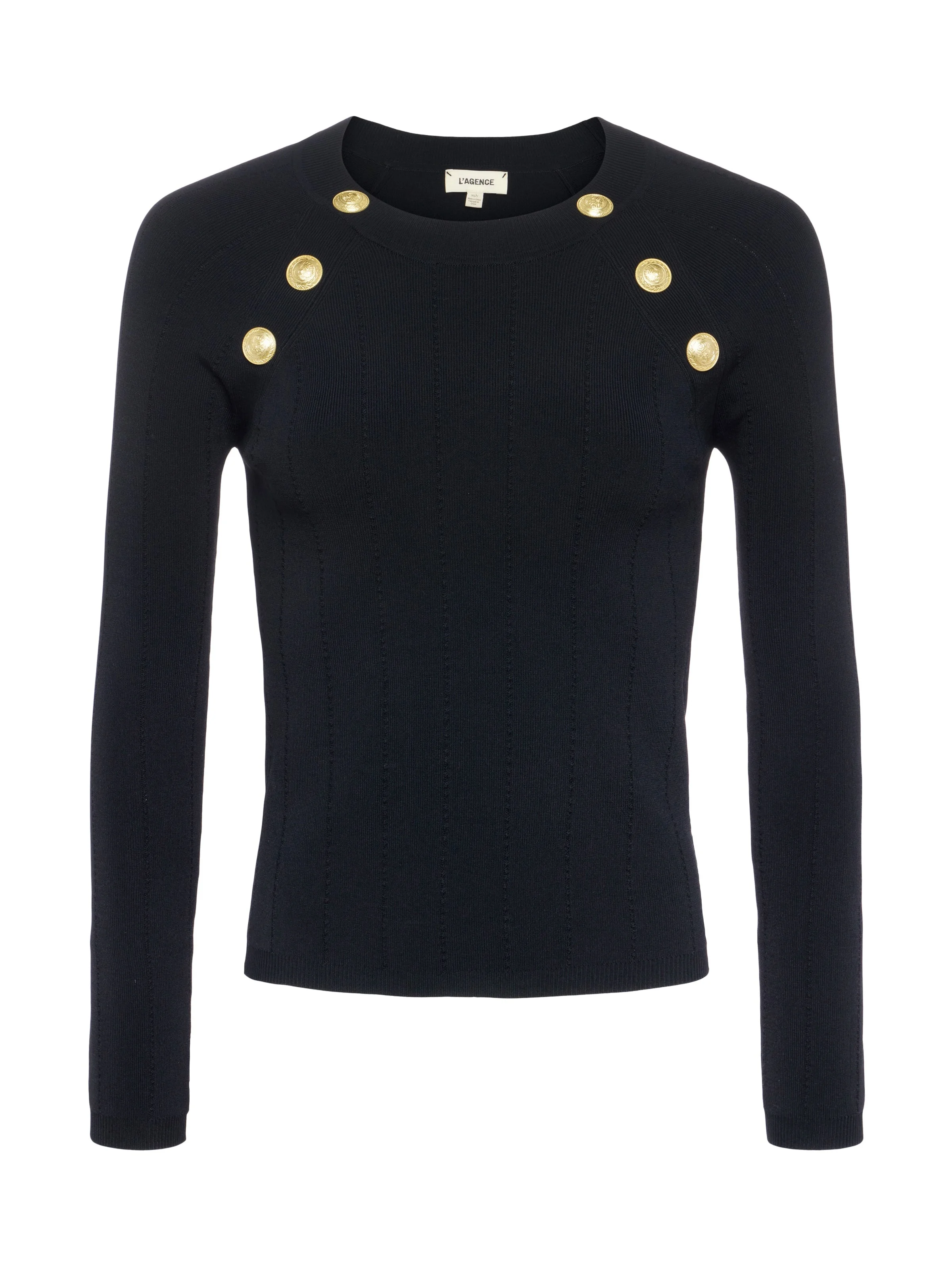 The quintessential crewneck, with a hint of glamour. • Lightweight stretch knit fabric • Strong shoulders • Raglan sleeves • No closures • Decorative embossed dome buttons Style No. 80022NXC-BLGO DETAILS & FIT - Model Details: Height 5'10" | Bust 32" | Waist 24'' | Hips 34.5'' | Wearing Size XS - About 21.5" From Shoulder to Hem - Sleeve Length: 28" MATERIALS & CARE Composition - 60% Rayon 38% Nylon 2% Spandex - Imported Care - Dry clean only