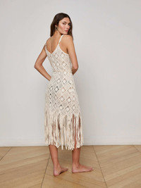 Boho meets beachy in this diamond-pattern crochet dress, featuring a flattering tie waist, spaghetti straps, and a fringe hem that moves with every step. • Unlined • Adjustable straps Style No. LG5TF36-NATU DETAILS & FIT - Model Details: Height 5'10" | Bust 32" | Waist 24" | Hips 34.5" | Wearing Size XS MATERIALS & CARE Composition - 100% Cotton Crochet - Imported