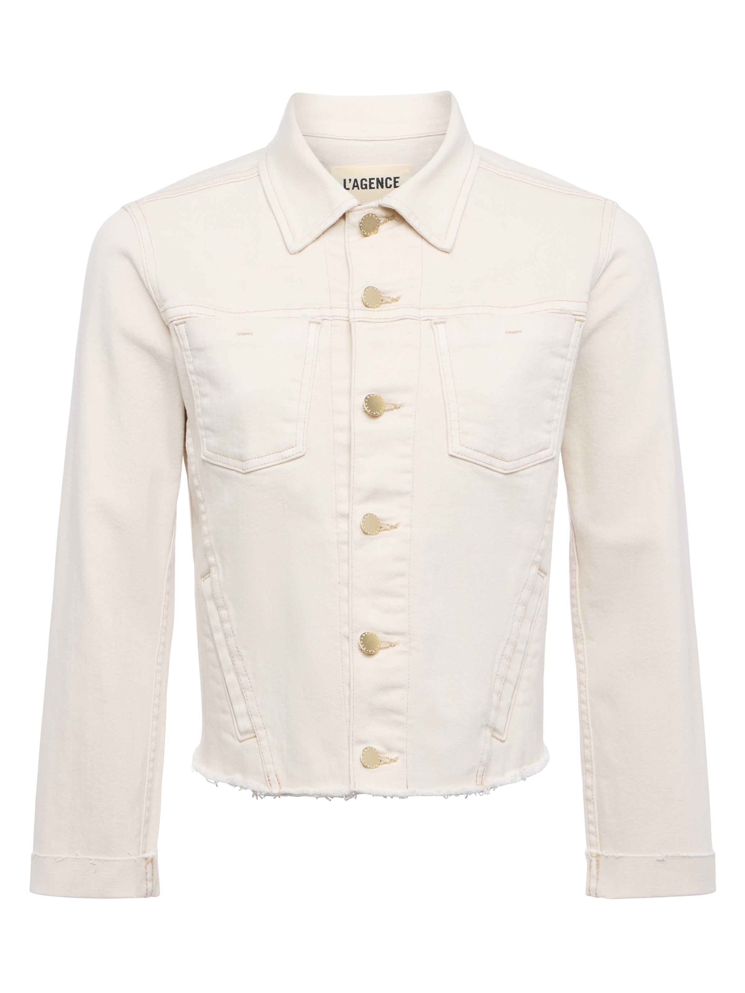 A flattering, feminine jacket, now a versatile neutral. This all-time bestseller is constructed with angled seams for waist definition. • Subtle stretch denim • 3/4 sleeves • Slim fit • Patch and welt pockets • Rivet buttons Style No. S1431KBOM-MACA DETAILS & FIT - Model Details: Height 5'10" | Bust 34" | Waist 24" | Hips 35" | Wearing Size XS - About 21" From Shoulder to Hem - Sleeve Length: 21.25" MATERIALS & CARE Composition - 98% Cotton 2% Spandex - Made in Los Angeles Care - Machine wash