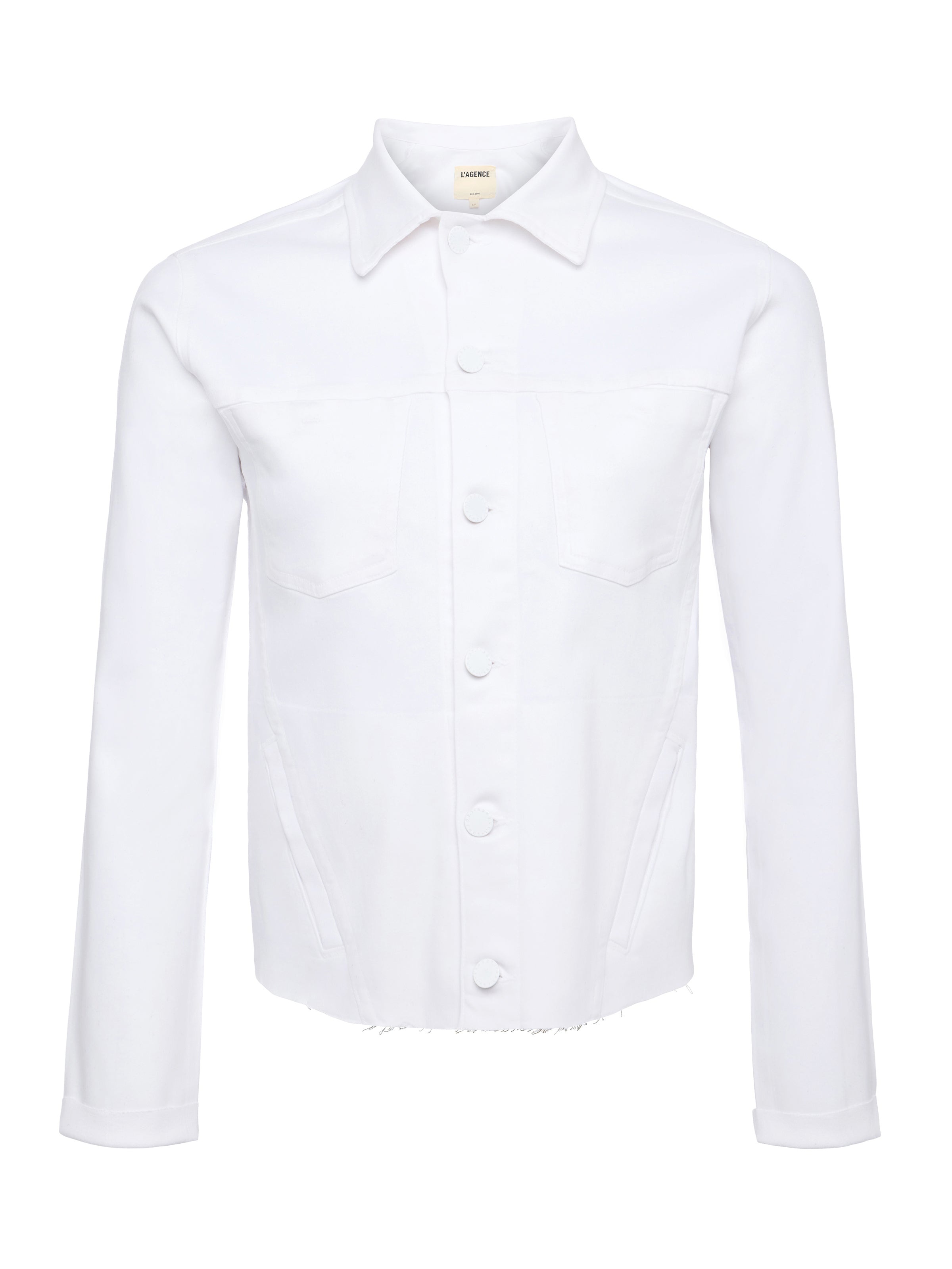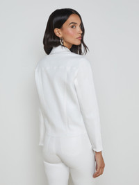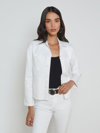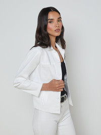 A flattering, feminine jacket, now updated in true white leather-look coated denim. This all-time bestseller is constructed with angled seams for waist definition. • Super stretch coated denim • 3/4 sleeves • Slim fit • Patch pockets and welt pockets • Rivet buttons Style No. 1431PDDC-BCCT DETAILS & FIT - Model Details: Height 5'9.5" | Bust 32" | Waist 24" | Hips 35" | Wearing Size XS - About 21" From Shoulder to Hem - Sleeve Length: 21.25" MATERIALS & CARE Composition - 86% Cotton 11% Elastane 3% Spandex - Made in Los Angeles Care - Spot wash disinfect - Dry clean only