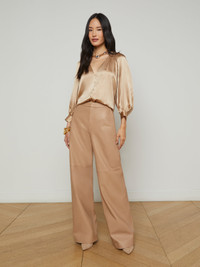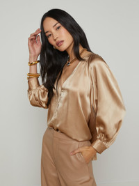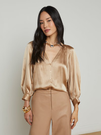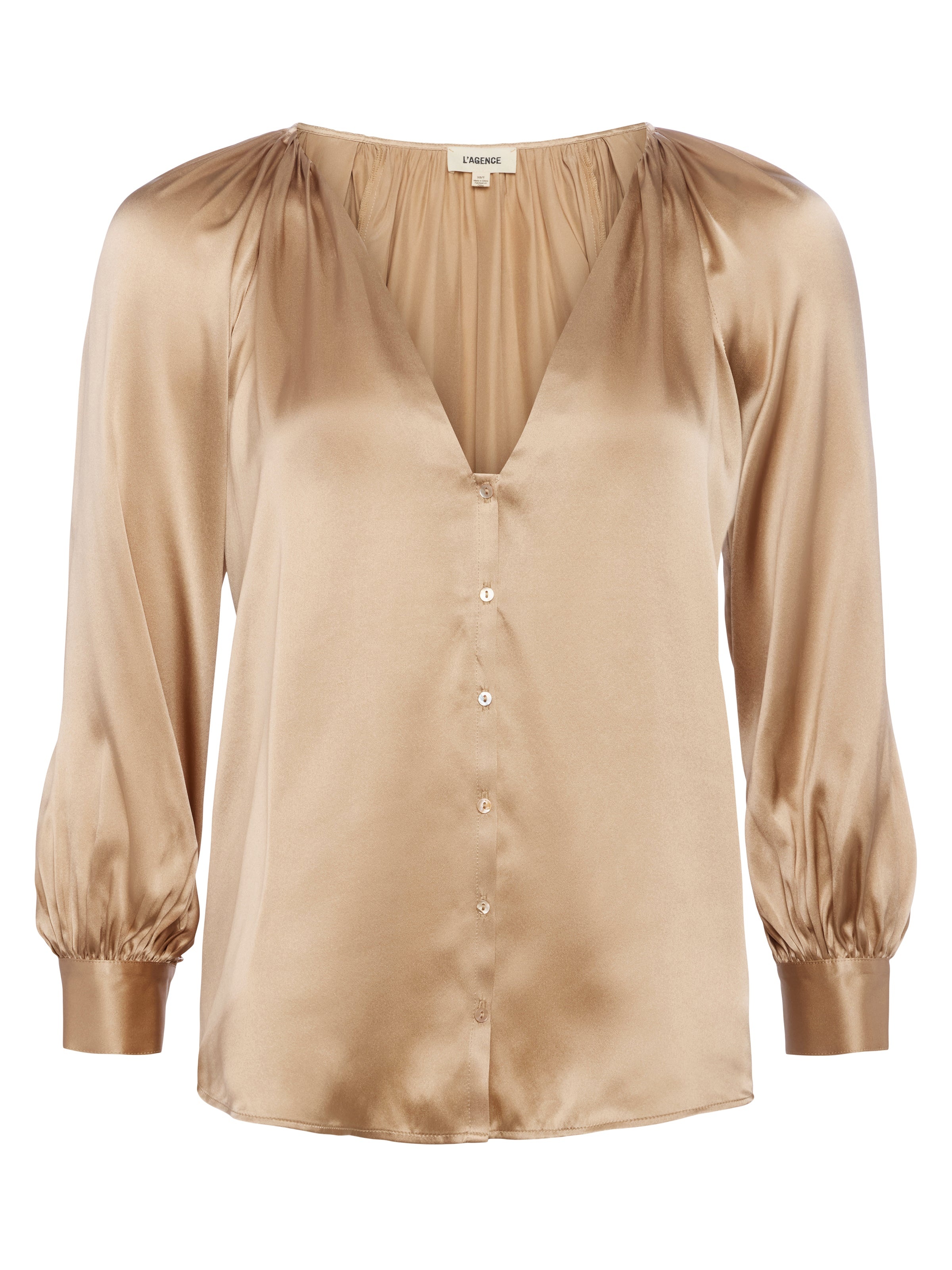 A silk blouse for the romantic in you. A soft V-neckline and gathered sleeves create feminine allure in this infinitely versatile blouse. • 100% silk charmeuse • 3/4 sleeves • Front button closure Style No. 40693CLW-ALMO DETAILS & FIT - Model Details: Height 5'9" | Bust 30" | Waist 24" | Hips 34" | Wearing Size XS - About 24.6" From Shoulder to Hem - Sleeve Length: 24.6" MATERIALS & CARE Composition - 100% Silk - Imported Care - Dry clean only - Do not wash - No bleach - No tumble dry - Low iron if needed