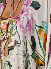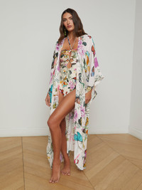 The Kara is not your average cover-up. A dramatic, sweeping silhouette elevates any look beyond typical beachwear. Pair it with a coordinating swimsuit or wear it with a tank and your favorite jeans. Now in a striking butterfly print. • Asymmetric hem • Hook & eye closure Style No. LG5AS26-VCBF DETAILS & FIT - Model Details: Height 5'10" | Bust 32" | Waist 24" | Hips 34.5" | Wearing Size OS - About 50" From Shoulder to Hem MATERIALS & CARE Composition - 100% Viscose - Imported Care - Dry clean