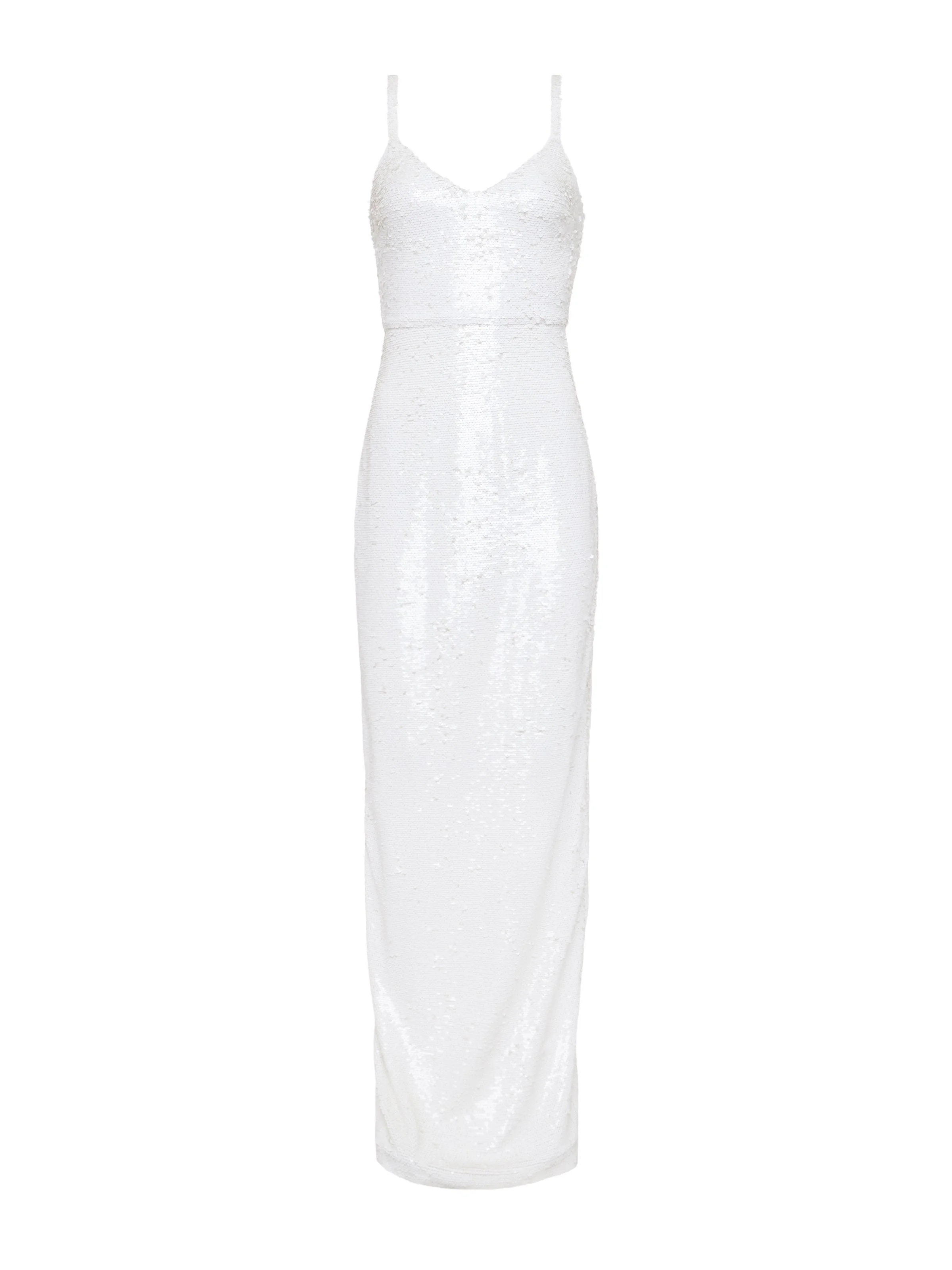 Make an entrance with the Karma. A sexy, structured bodice meets light-catching white sequins for a body-skimming statement in this sophisticated stunner made for special moments. • Allover sequins • Lined • Invisible back zip • Back slit Style No. 61442REO-WHAS DETAILS & FIT - Model Details: Height 5'10" | Bust 32" | Waist 23.5" | Hips 34.5" | Wearing Size 2 - About 55.25" From Shoulder to Hem MATERIALS & CARE Composition - 100% Polyester - Imported Care - Spot clean only - No dry clean