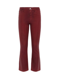 Kendra is the perfect wear-now option for petites and cropped-flare lovers—no tailoring required. • Leather-look coated stretch denim • High-rise cropped flare • Front faux pockets • Functional back pockets • Raw hem • Front zip fly and button closure • 26” inseam Style No. 2714PDDC-SYRC DETAILS & FIT - Model Details: Height 5'10" | Bust 32" | Waist 24'' | Hips 34.5'' | Wearing Size 25 - Rise: 9.5" - Inseam: 26" - Leg Opening: 17" MATERIALS & CARE Composition - 86% Cotton 11% Elastane 3% Spandex - Made in Los Angeles Care - Spot wash disinfect - Dry clean only