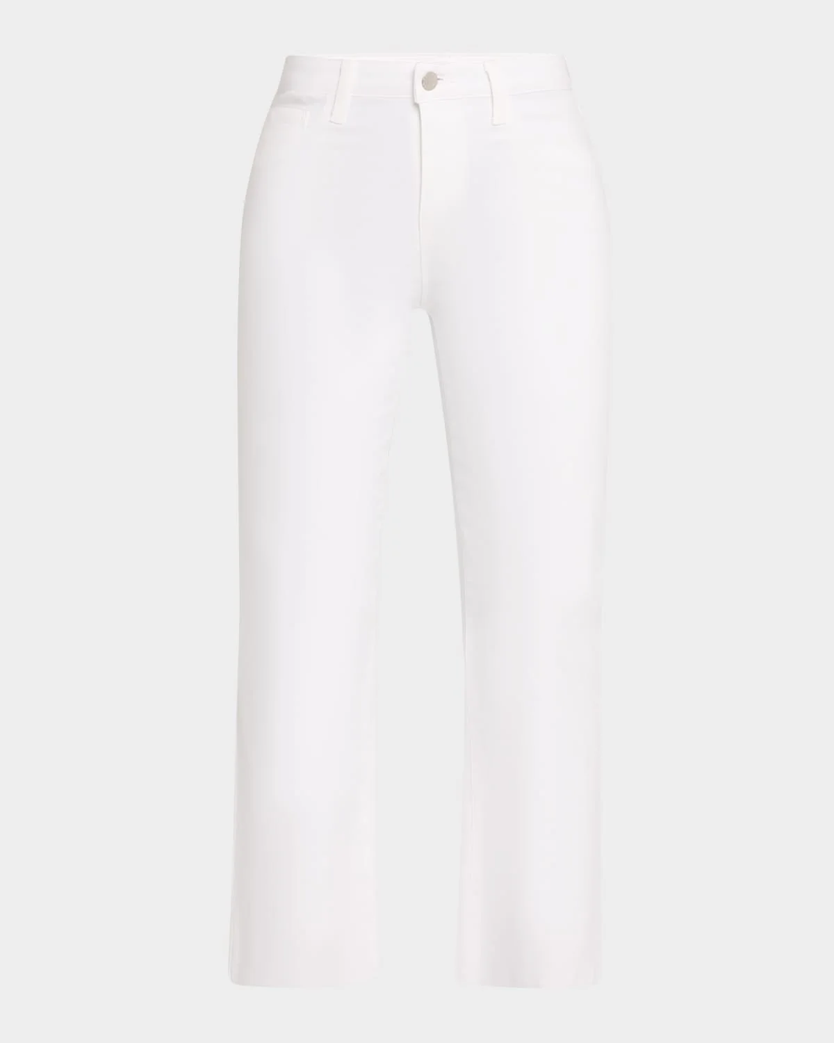 - L'Agence "Kendra" jeans in coated stretch denim - Approx. 26" inseam - High rise - Five-pocket style - Fitted through hip; flared from knee - Cropped fit - Raw-edge hem - Button/zip fly; belt loops - Cotton/elastane/spandex - Made in USA - Model is 5'10"/177cm.