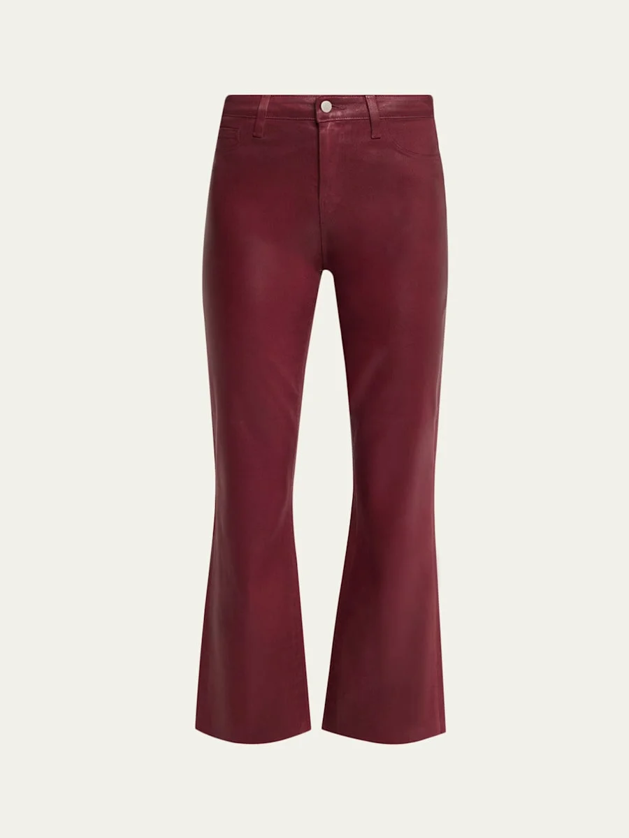 L'Agence "Kendra" jeans in coated stretch denim Approx. 26" inseam High rise Five-pocket style Fitted through hip; flared from knee Cropped fit Raw-edge hem Button/zip fly; belt loops Cotton/elastane/spandex Made in USA Model is 5'10"/177cm. Online Inquiries: BGS21_T2EP1| Store Inquiries: #4165555