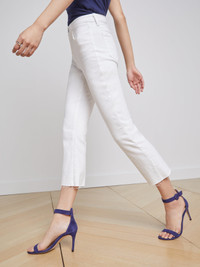 A high-rise cropped flare jean in a bright white. In a premium stretch denim, the style hugs from contoured waistband to knee before extending into a chic flare hem. Finished with an effortless raw hem and 5-pocket construction. Zip fly closure. Style No. 2651ISK-BLAN DETAILS & FIT - Model Details: Height: 5’10" | Bust 34” | Waist 24" | Hips 35” | Wearing Size 25 - Rise: 9.5” - Inseam: 26” - Leg Opening: 17” MATERIALS & CARE Composition - 93% Cotton, 6% Polyester, 1% Spandex - Constructed in the USA of Imported Materials Care - Machine wash