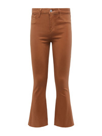 A high-rise cropped flare jean in a lustrous coated premium denim with a coffee-brown hue. High-recovery denim hugs from waistband to knee before extending into a flared cropped leg finished with raw hem. Includes five-pocket construction and front zip fly closure. Style No. 2714PDDC-JACO DETAILS & FIT - Model Details: Height: 5’10" | Bust 34” | Waist 24" | Hips 35” | Wearing Size 25 - Rise: 9.5” - Inseam: 26” - Leg Opening: 17” MATERIALS & CARE Composition - 86% Cotton, 11% Elastane, 3% Spandex - Made in Los Angeles Care - Spot wash disinfect - Dry clean only