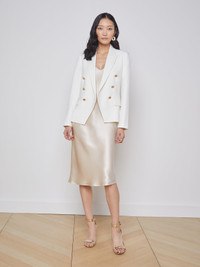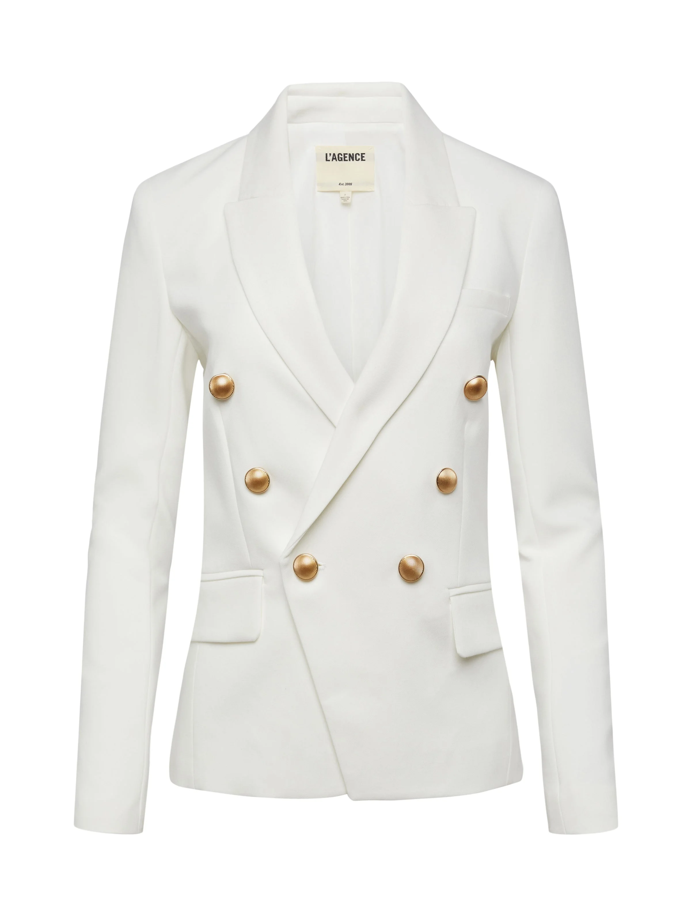An expertly crafted double-breasted blazer in ivory. Smart, tailored construction featuring strong shoulders, peaked lapels, seamed flap pockets, and a fitted, tapered waist. Detailed with six domed buttons in rose gold. Double button closure, fully lined. Style No. 1432PMB-IVOR DETAILS & FIT - Model Details: Height: 5’10" | Bust 34” | Waist 24" | Hips 35” | Wearing Size 2 - About 26" From Shoulder to Hem - Sleeve Length: 25" MATERIALS & CARE Composition - 73% Polyester, 20% Viscose, 7% Spandex - Imported Care - Machine wash in cold - Do not bleach - Flat dry - Cool iron if needed or dry clean