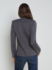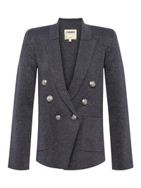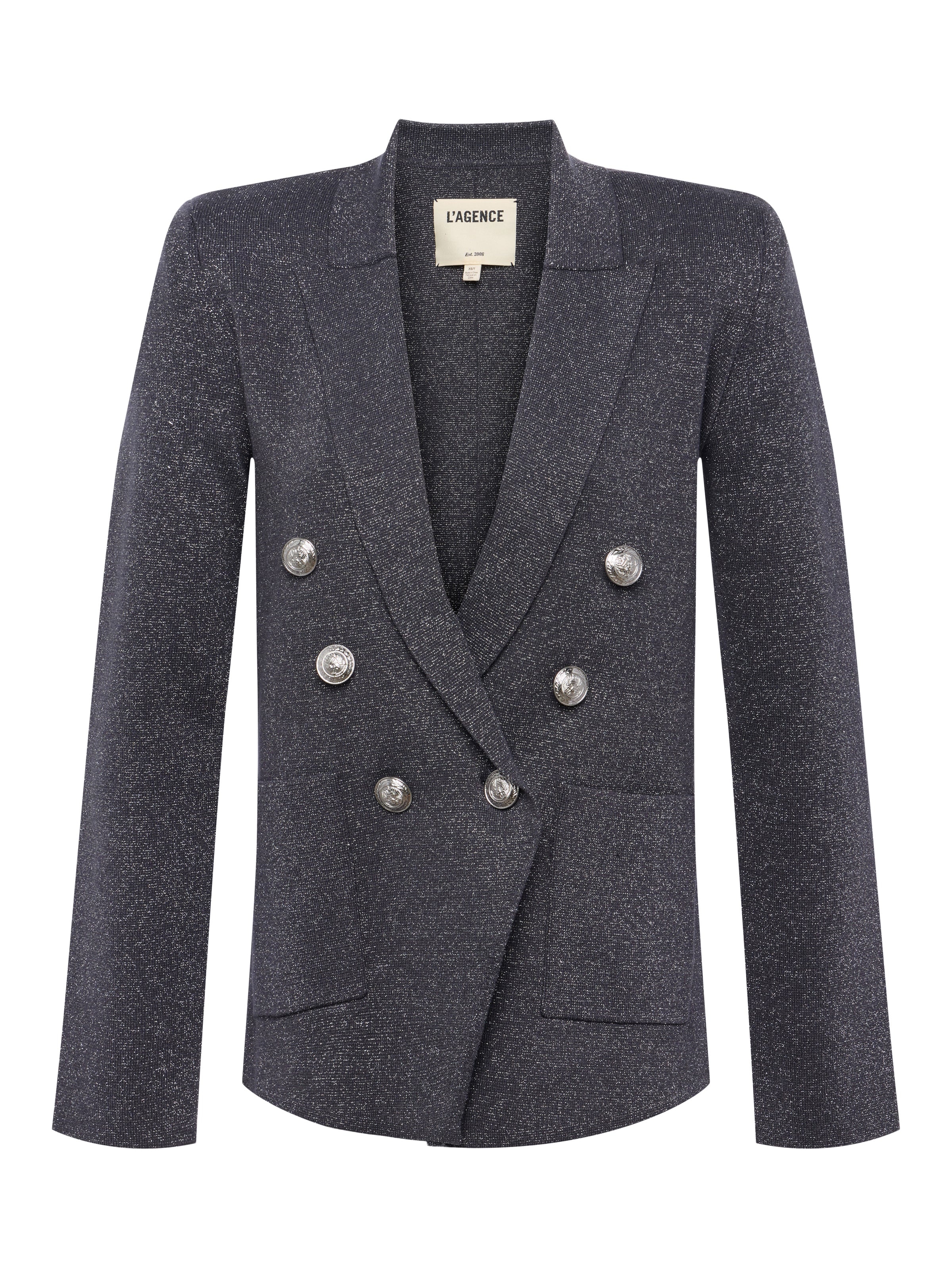 Our double-breasted Kenzie blazer is a L’AGENCE classic and a bestseller season after season, featuring a tailored slim fit. Now in a comfortable, travel-ready knit with a sophisticated sparkle. • Heavyweight lurex knit • Embossed dome buttons • Strong shoulders • Peaked lapels • Front patch pockets Style No. 8999FBA2-DKSS DETAILS & FIT - Model Details: Height 5'10" | Bust 32" | Waist 24" | Hips 34.5" | Wearing Size XS - About 25.8" From Shoulder to Hem - Sleeve Length: 23.75" MATERIALS & CARE Composition - 33% Acrylic 26% Cotton 22% Lurex 19% Nylon - Imported